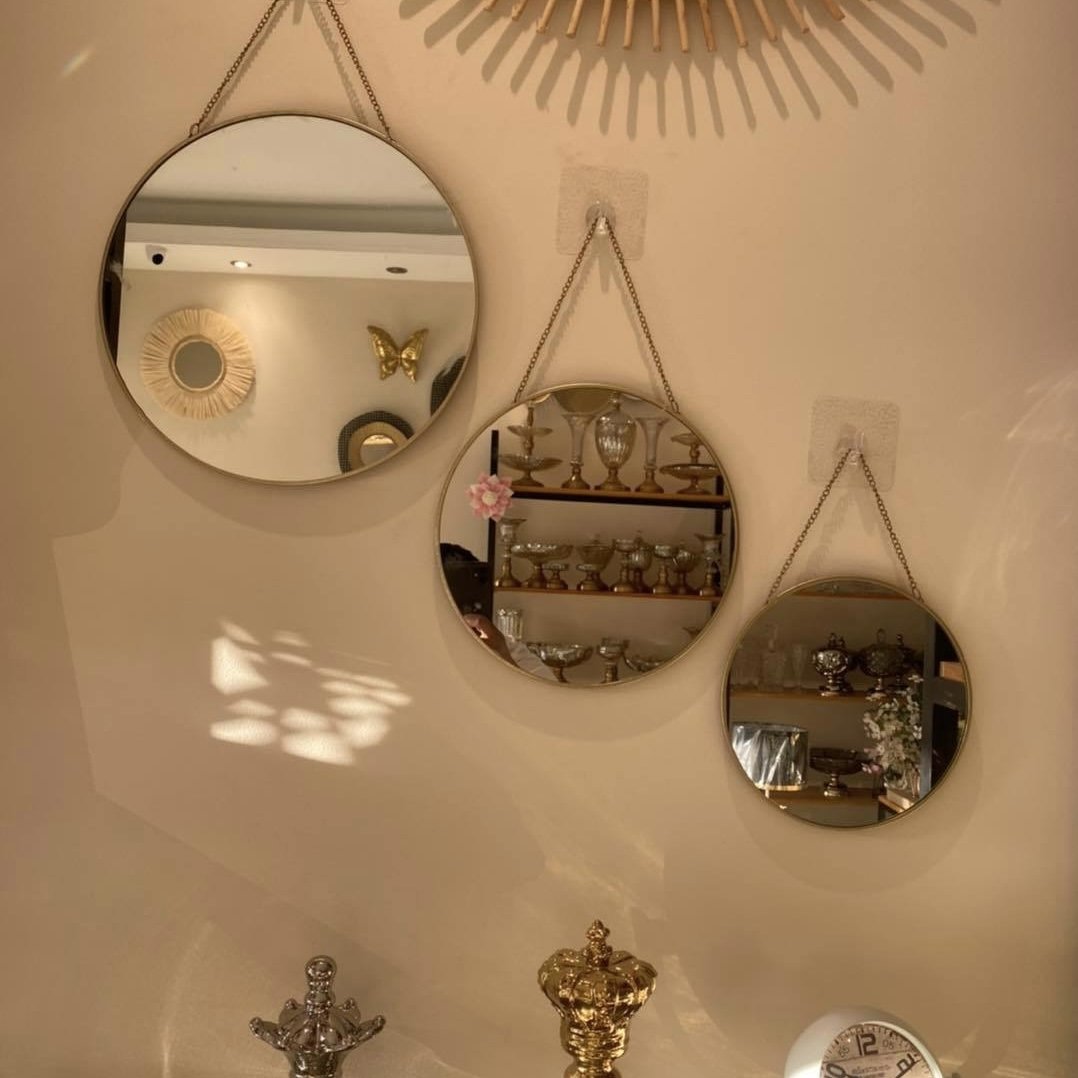 A set of three stylish round mirrors with gold chain hangers — perfect for adding elegance and depth to your living room, hallway, or bedroom. The mirrors reflect light beautifully and create a sense of openness and sophistication.