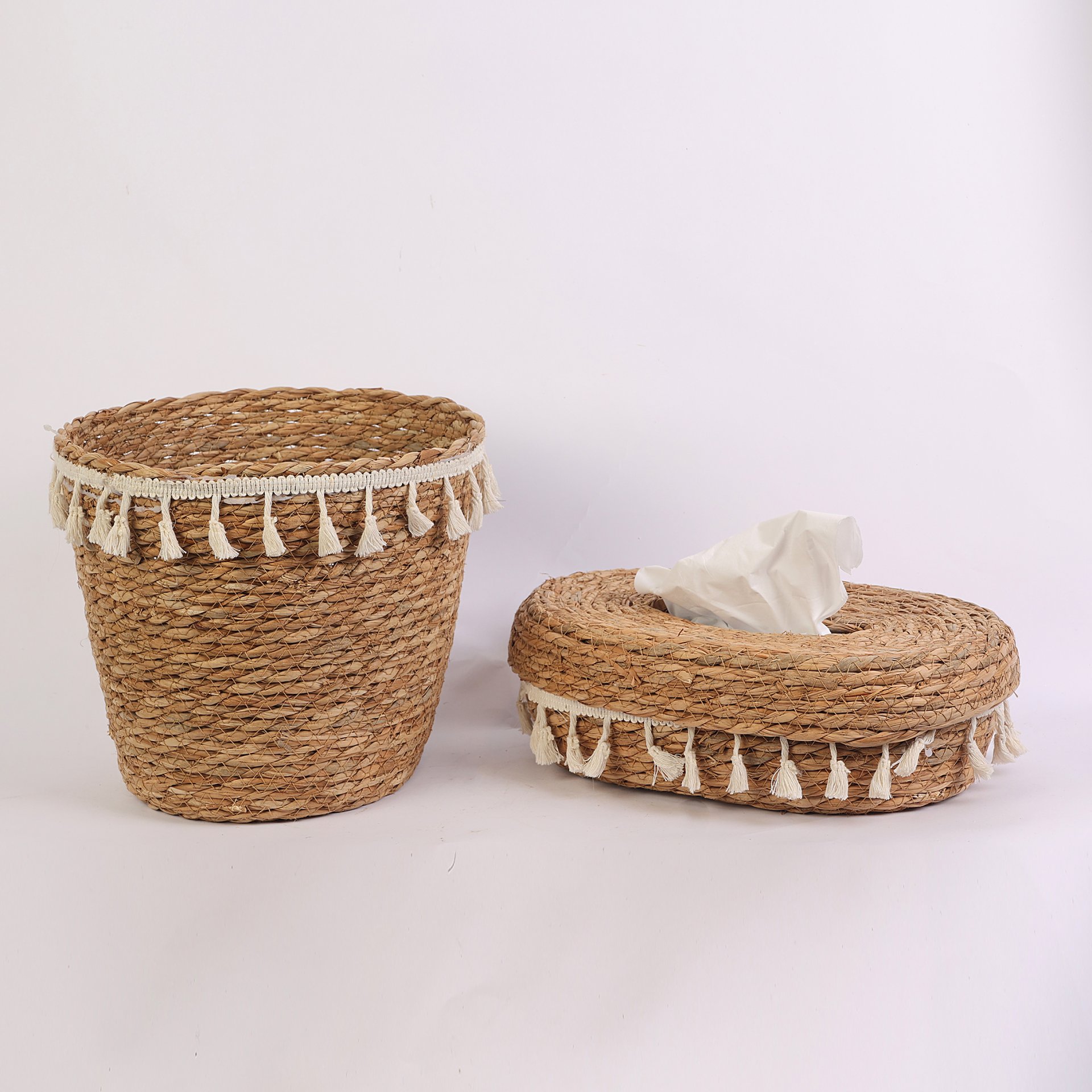 Handcrafted tissue box and basket made from wicker and natural fibers, featuring a stylish design that blends natural beauty with practical functionality. These eco-friendly pieces add a touch of warmth and rustic elegance to any decor. The tissue box is perfect for placing on tables or shelves, while the basket can be used for storing small items or as a standalone decorative piece. The natural design and durability make them an ideal addition to any home looking for a touch of nature.