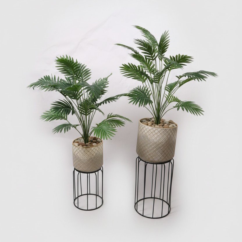 نبتة ديكور صناعية في أصيص بنقشة هندسية مع قاعدة معدنية طقم قطعتين