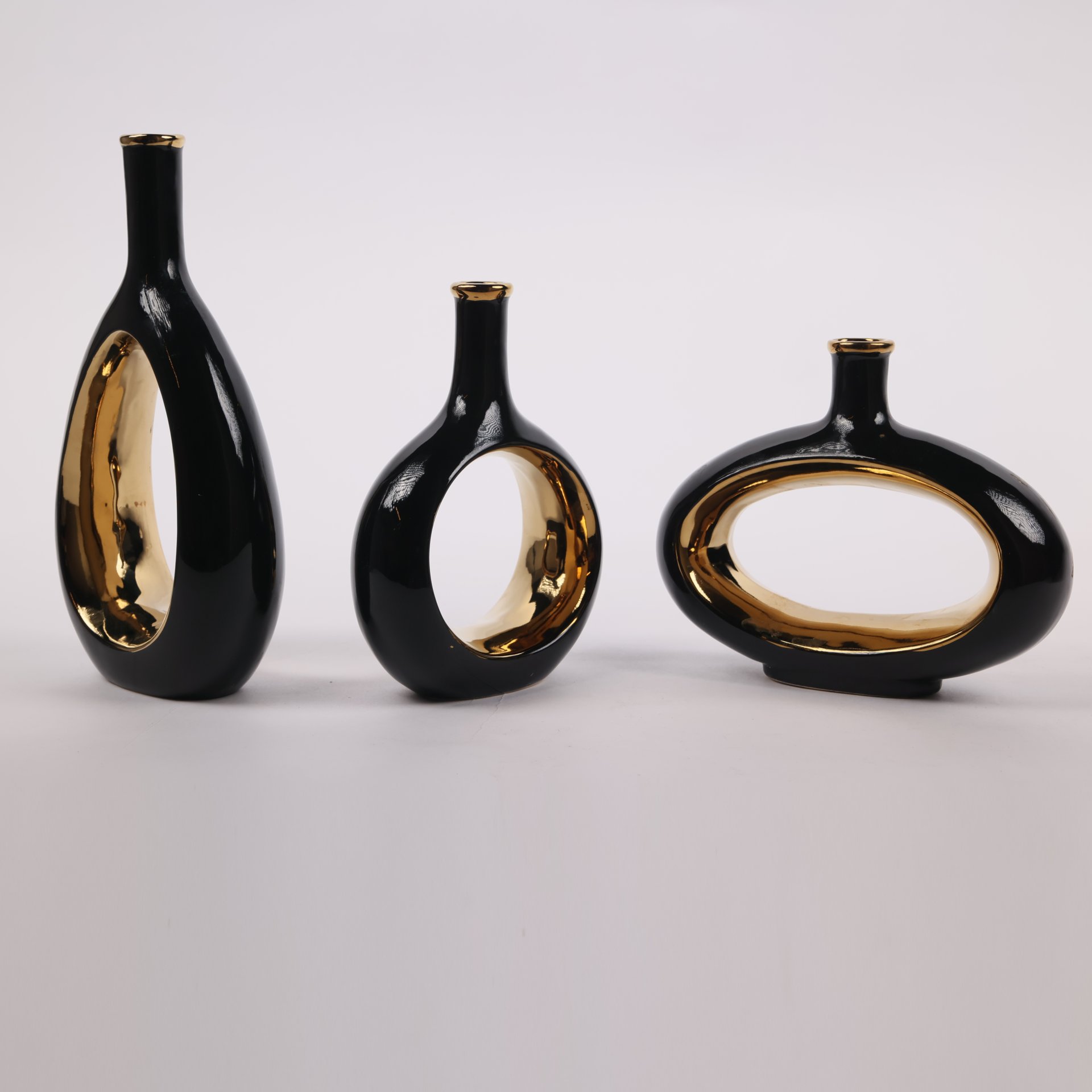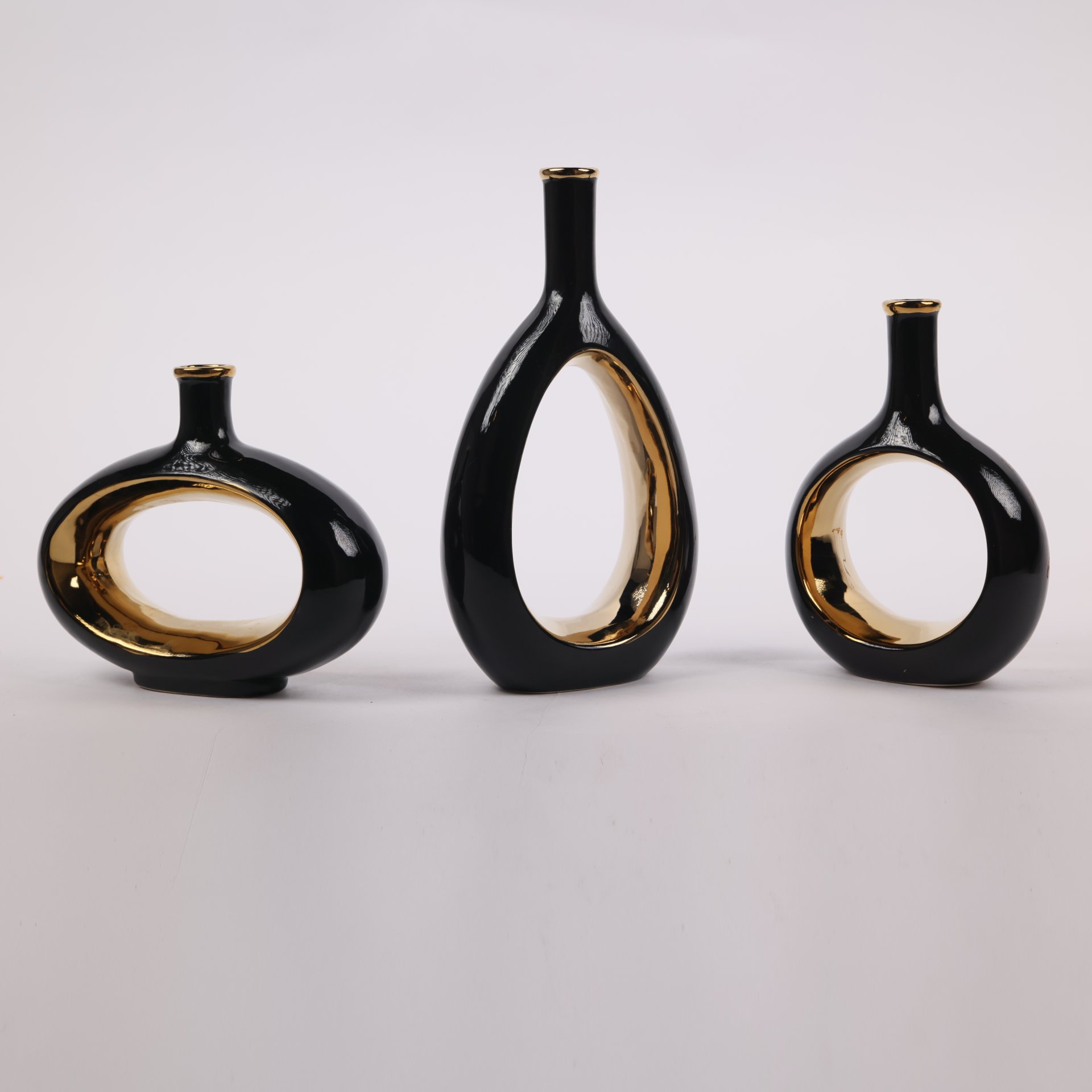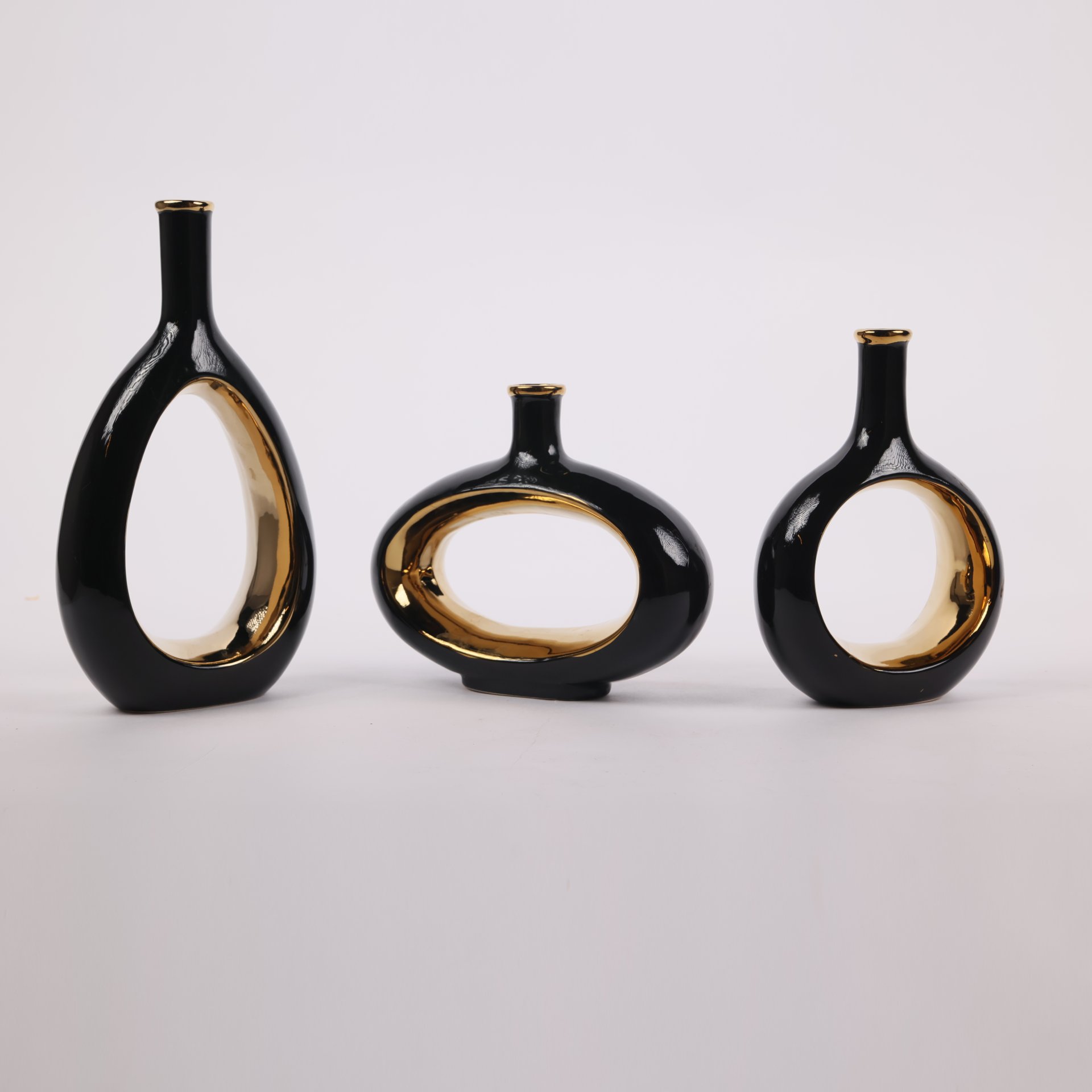 مزهريات سيراميك أسود بلمسة ذهبية عصرية طقم من 3 قطع
