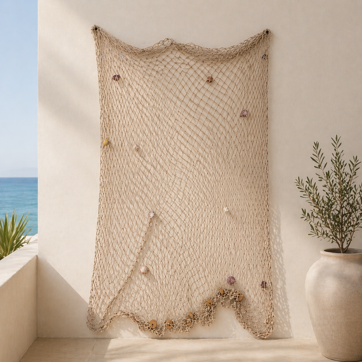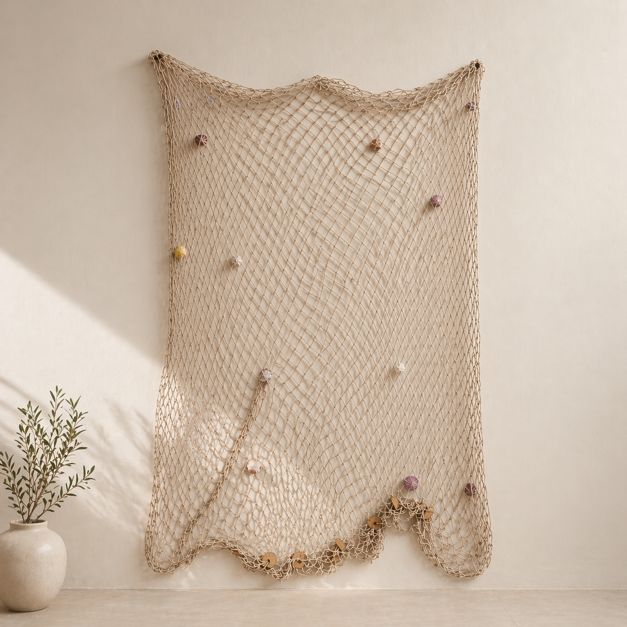 أضف أجواء البحر الهادئة إلى منزلك مع شبكة الصيد الديكورية المصممة بلون بيج طبيعي أنيق. تتميز بتفاصيل رقيقة ولمسات من الأصداف تمنحها طابعاً ساحلياً مميزاً، كما تضيف عمقاً وحركة للجدار بأسلوب بسيط وراقي. لونها المحايد يجعلها مناسبة للديكورات المينيمال، البوهو، الريفية، أو المساحات الساحلية الهادئة. مثالية لغرف المعيشة، الشاليهات، الكافيهات، غرف النوم، البلكونات، أو المنازل الصيفية. يمكن استخدامها بمفردها أو تنسيقها مع إضاءات وصور وإكسسوارات صغيرة لإطلالة شخصية مميزة.