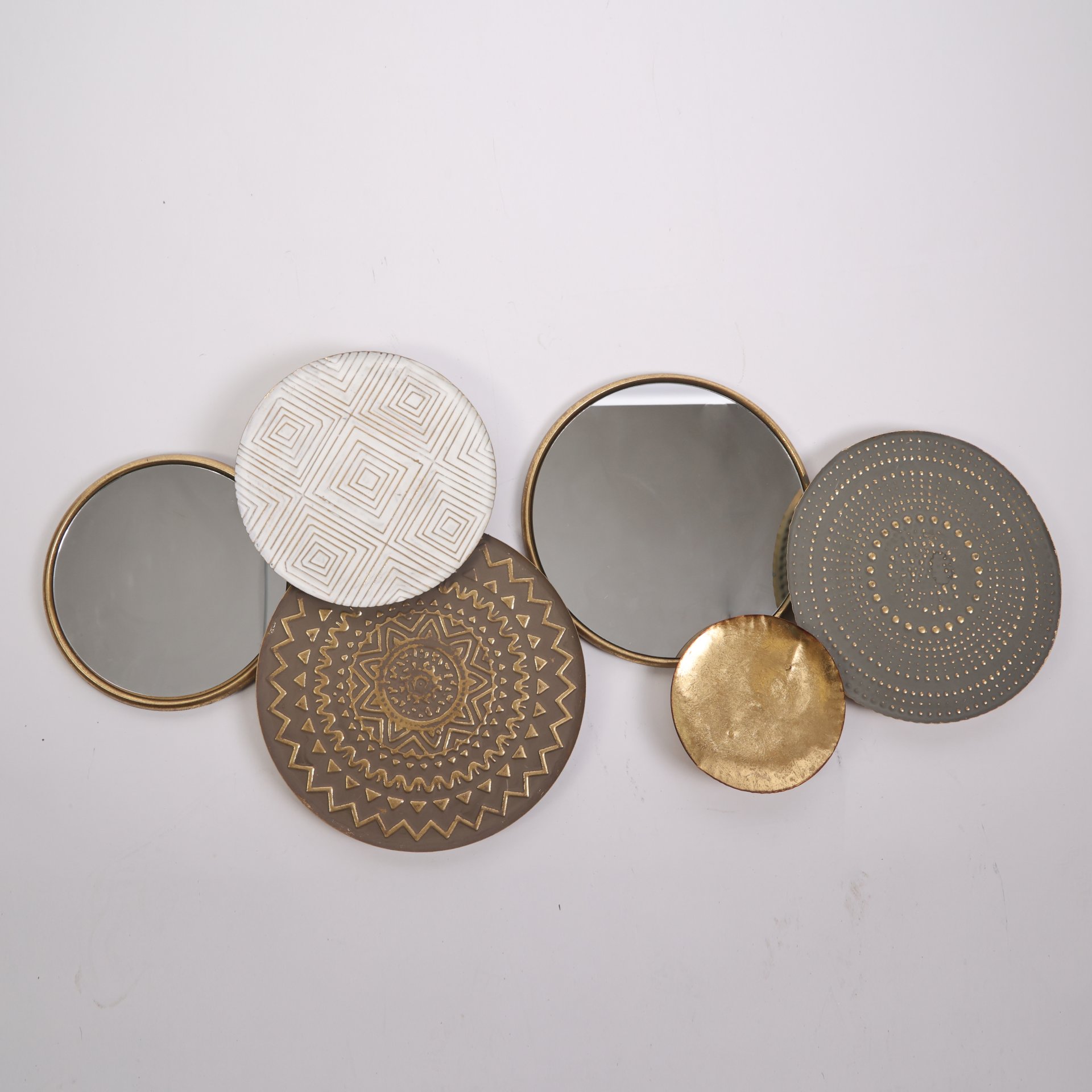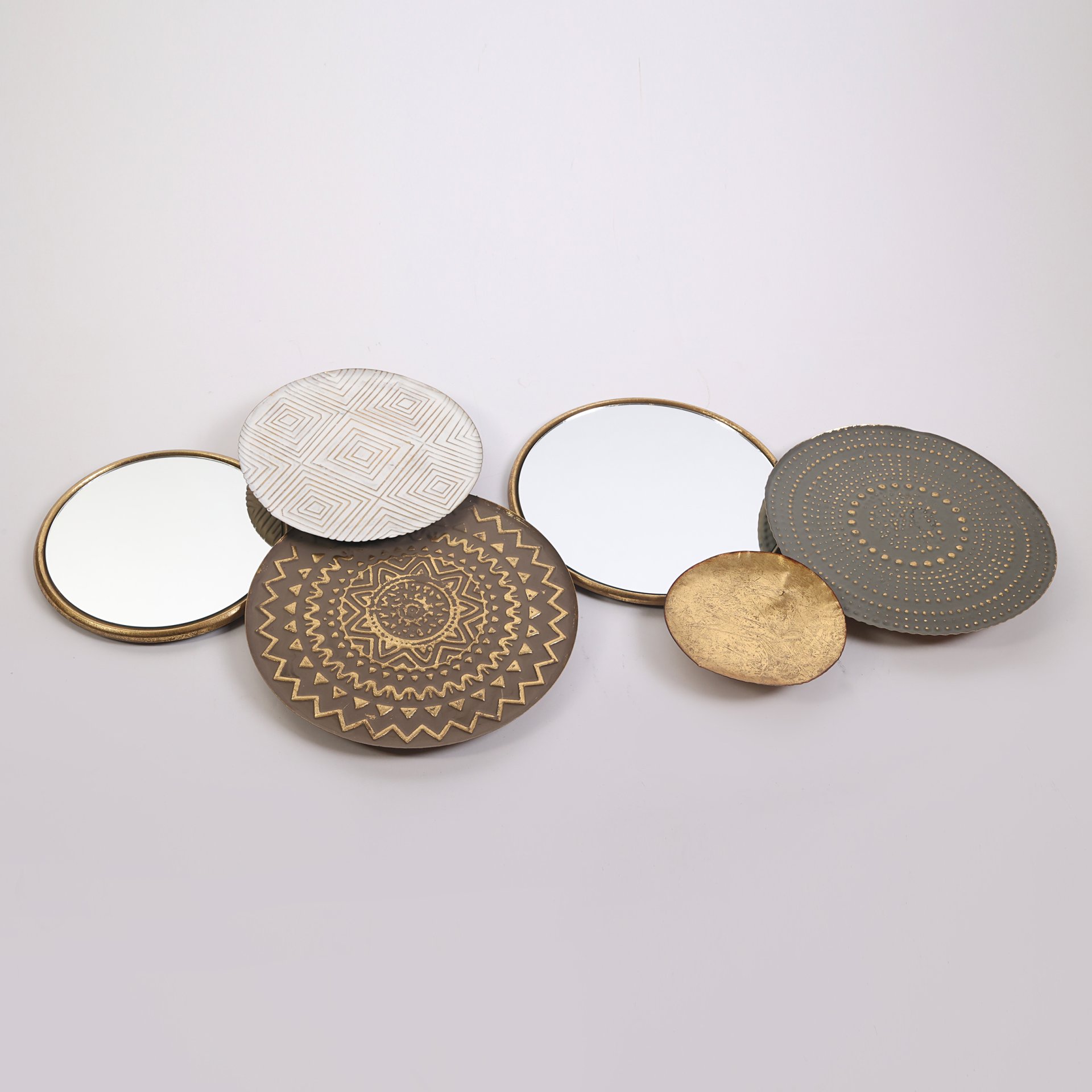 قطعة فنية جدارية مكونة من دوائر معدنية بألوان متنوعة (ذهبي، أبيض، رمادي)، مع مرايا ونقوش مميزة. مثالية لغرف المعيشة، المداخل أو فوق السرير، وتضفي دفئًا وأناقة للمكان.