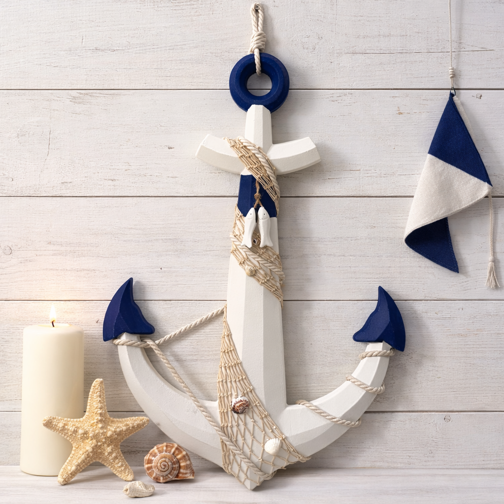 أضف أجواء البحر والهدوء إلى منزلك مع ديكور حائط مرساة بحرية مع شبكة. يتميز بتصميم مرساة كلاسيكي بألوان أزرق وأبيض أنيقة مع إضافات جميلة مثل الشبكة، الأصداف، وتعليقات الأسماك الصغيرة ليمنح المكان لمسة بحرية مميزة.