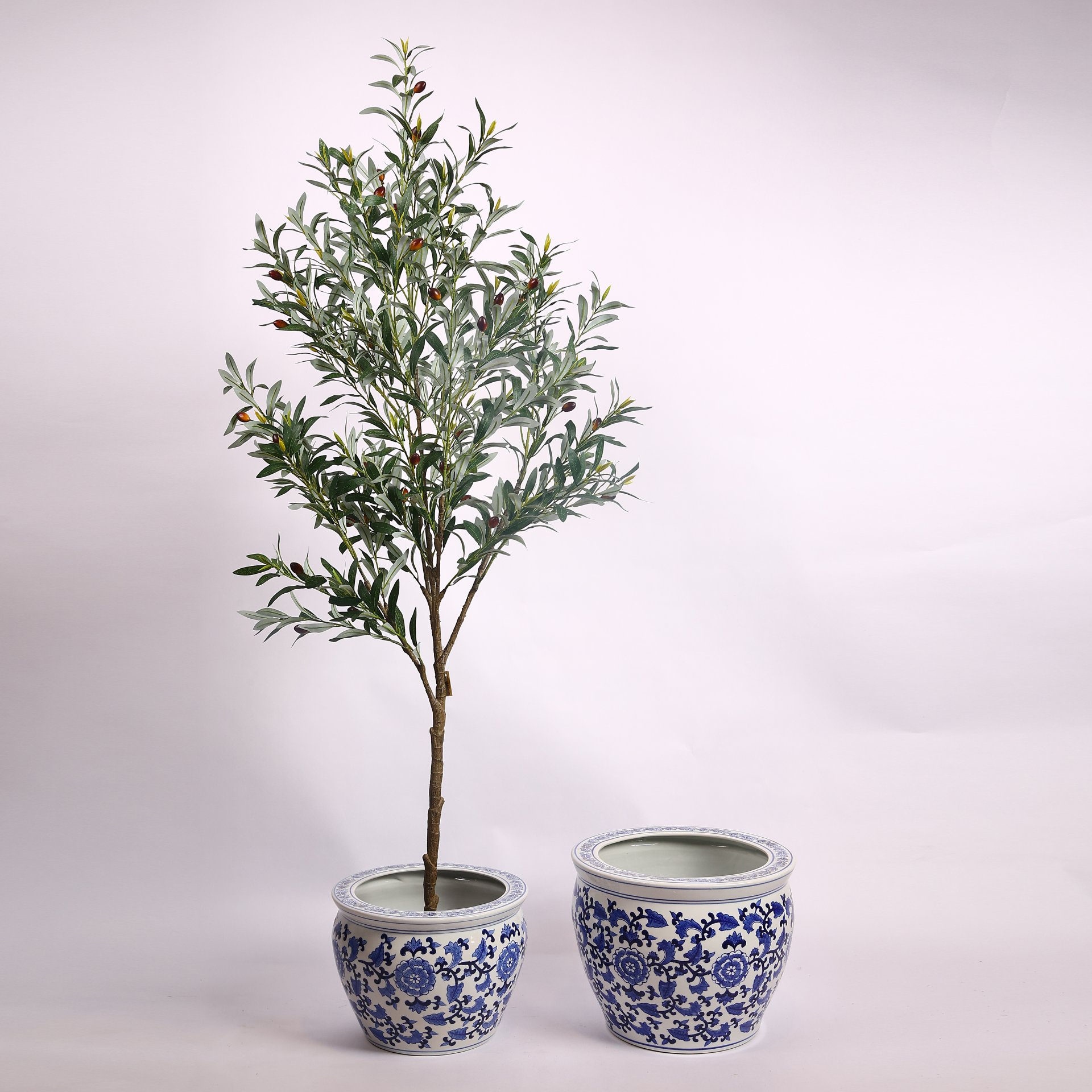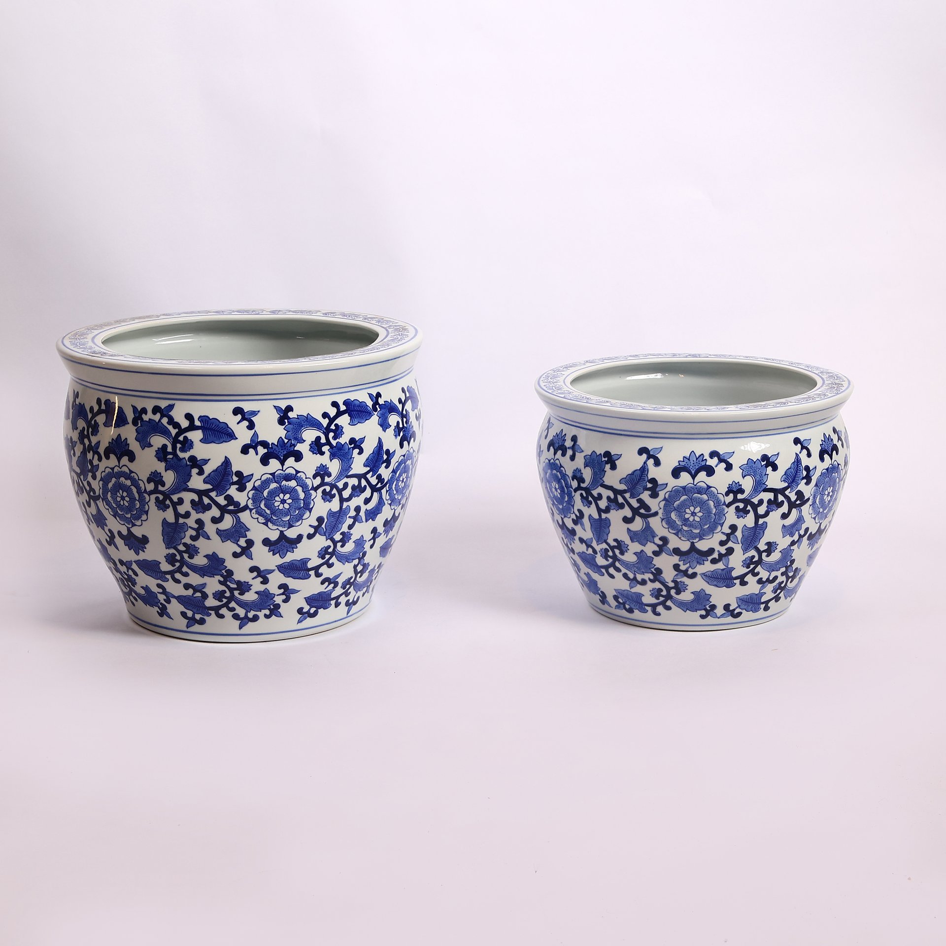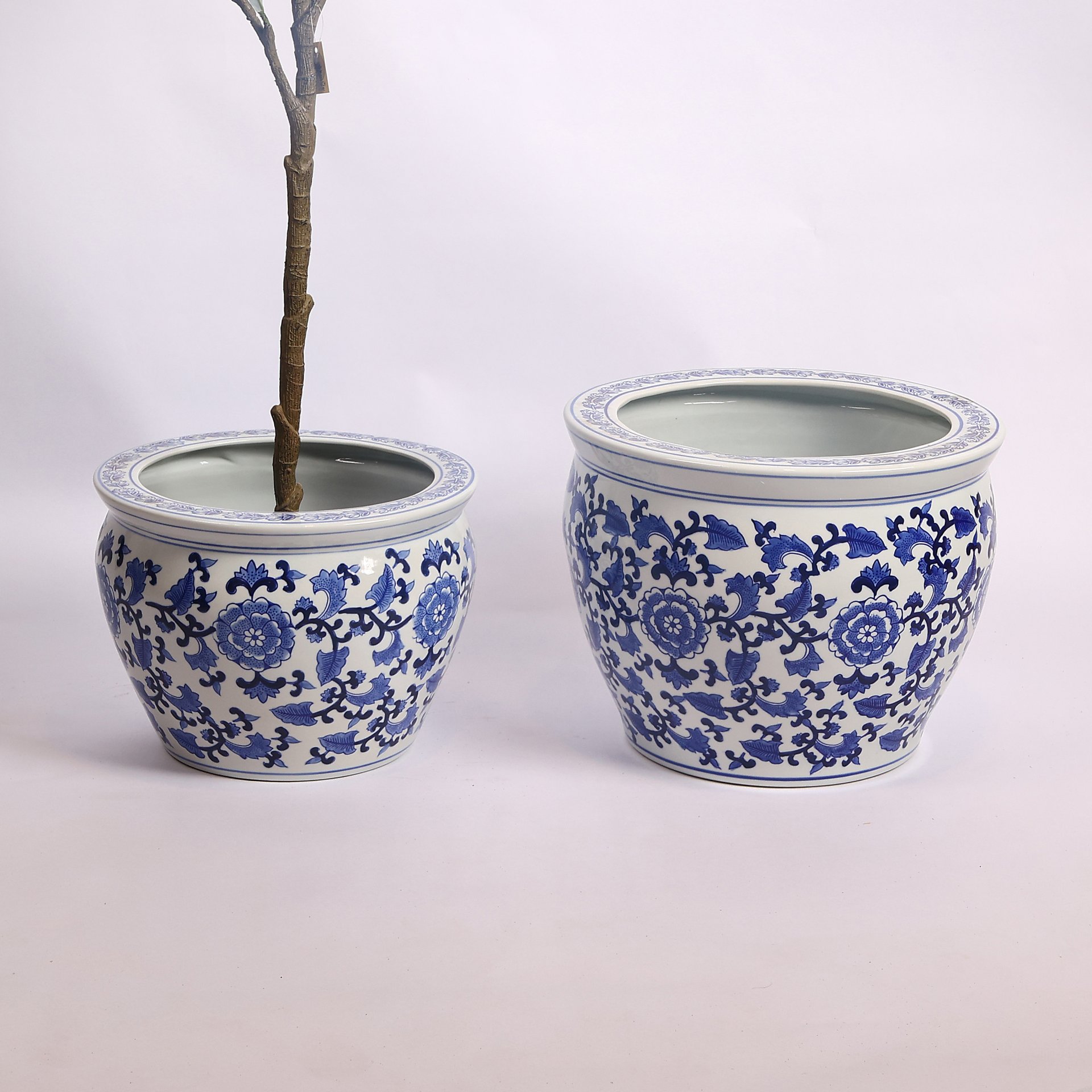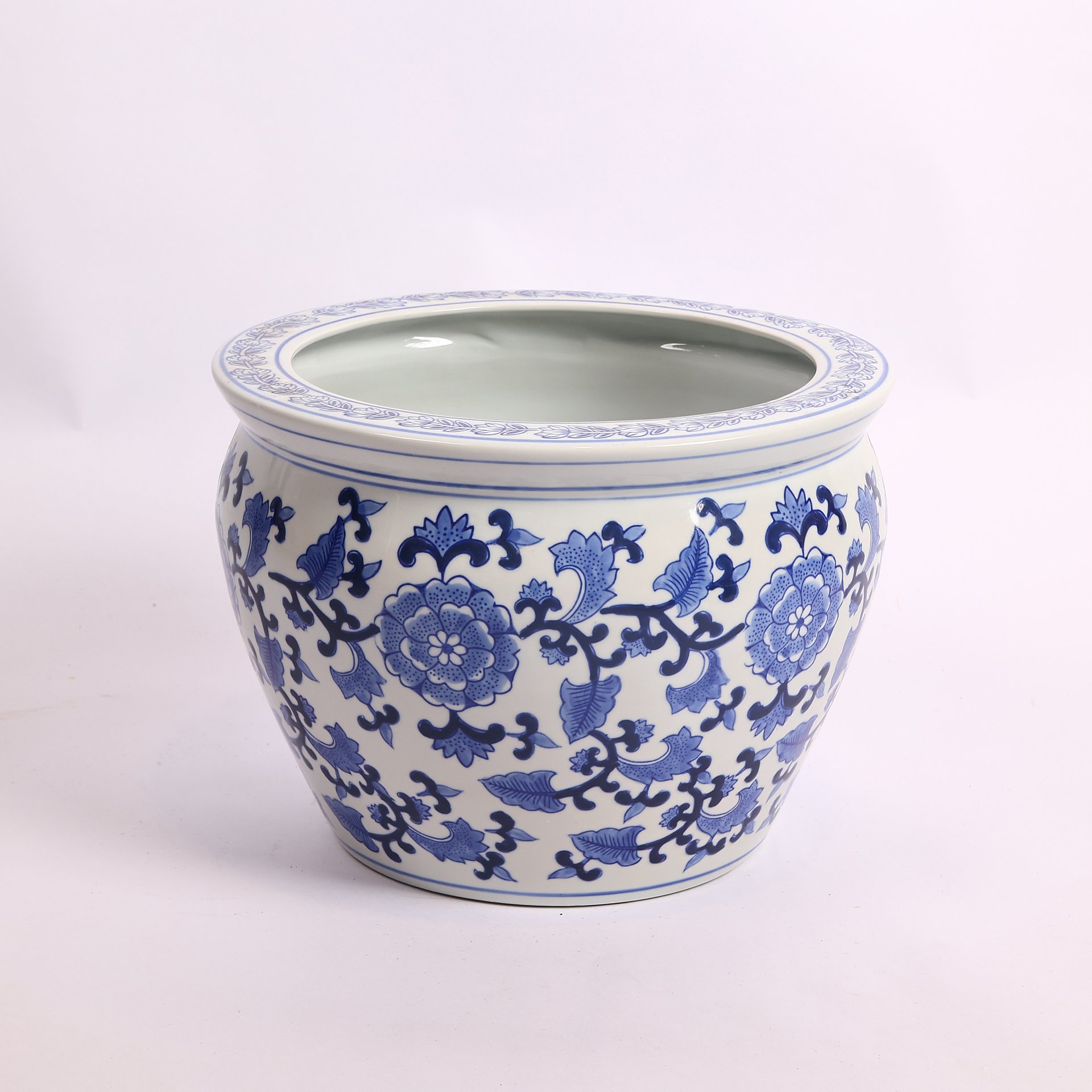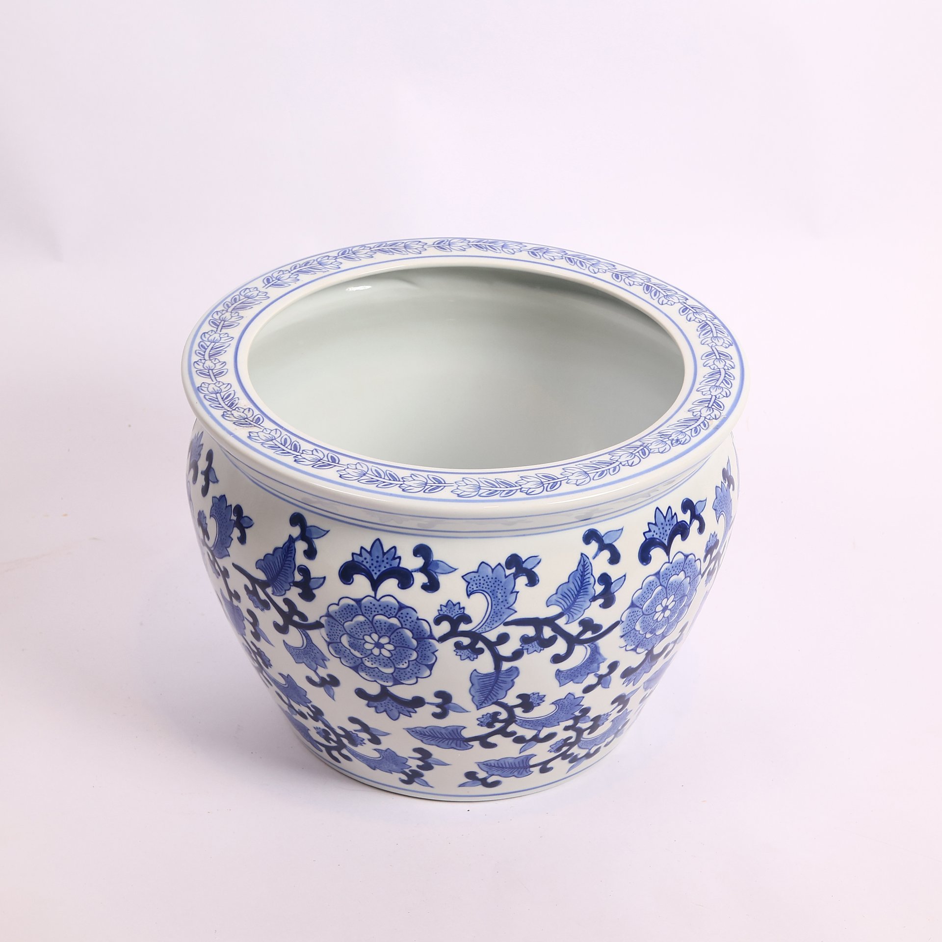 إناء خزفي صيني كلاسيكي باللونين الأزرق والأبيض، مصنوع من البورسلين الفاخر بتصميم زهور أنيق. يتميز بجودة عالية ولمسة فنية فريدة، مما يجعله مثاليًا لديكور المنزل أو الحديقة. يمكن استخدامه كوعاء للنباتات أو كقطعة زينة تضيف لمسة فخامة لأي مساحة.