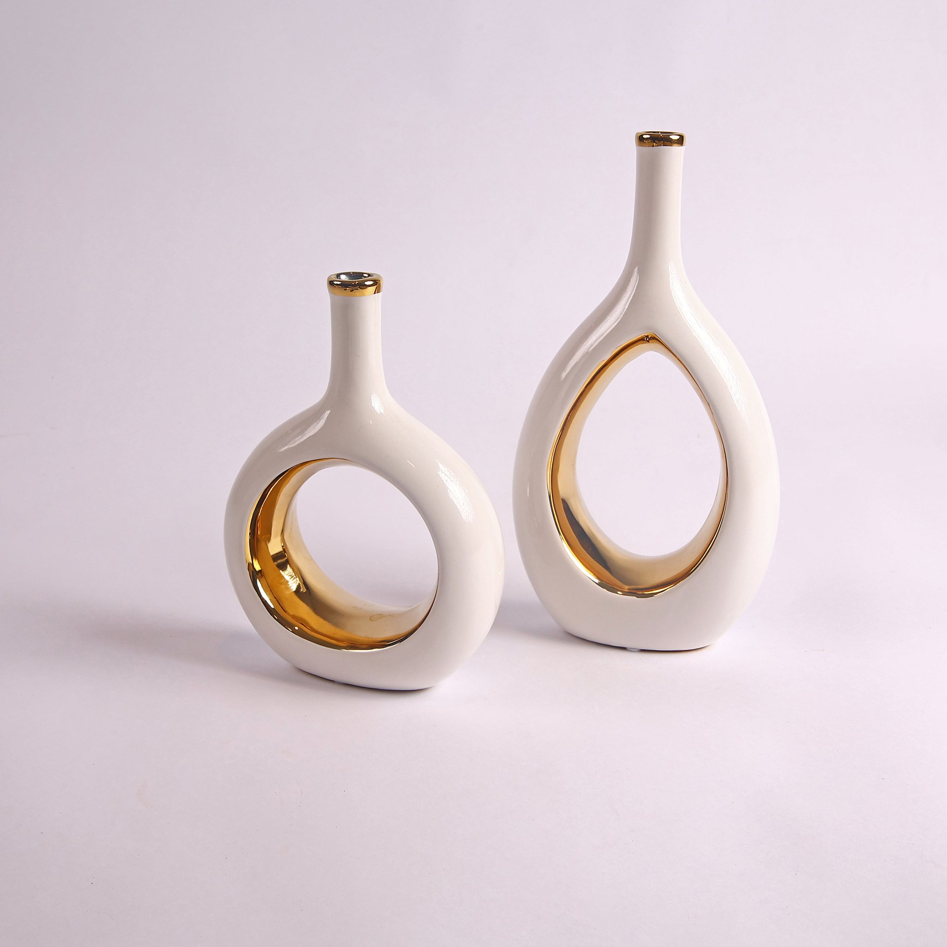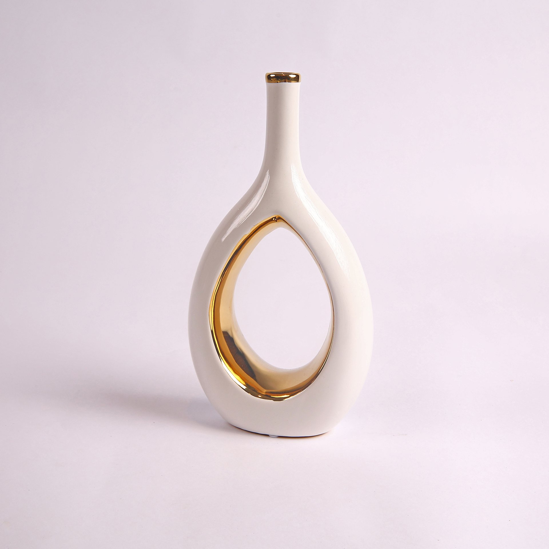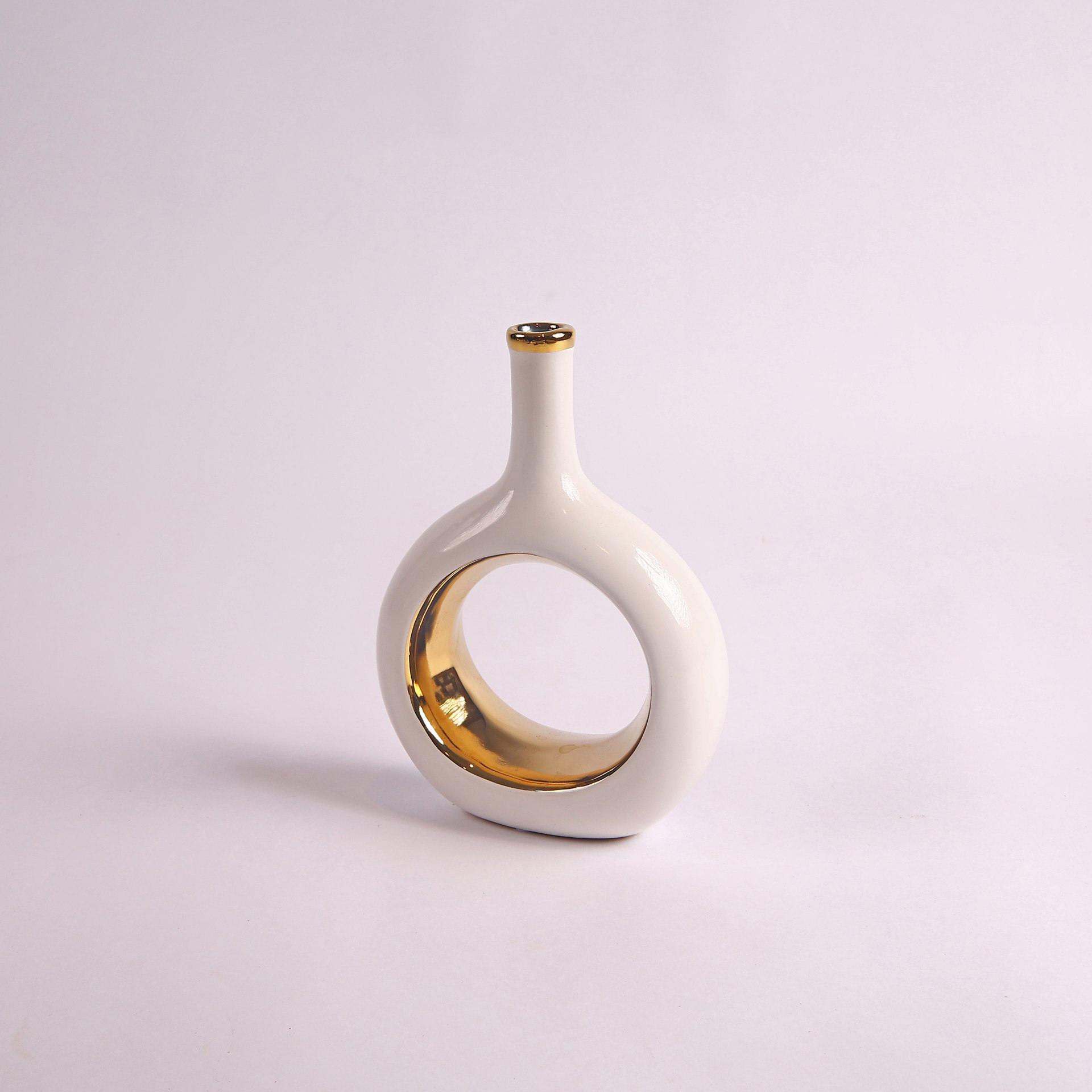 ارتقِ بديكور منزلك مع هذه الفازة البورسلين الفاخرة التي تتميز بتصميم عصري أنيق يجمع بين البساطة والفخامة. بفضل لونها الأبيض اللامع وتفاصيلها الذهبية الراقية، تعد هذه الفازة إضافة مثالية لأي غرفة، سواء في غرفة المعيشة، المكتب، أو طاولة الطعام. يمكن استخدامها كقطعة ديكور مستقلة أو لعرض الزهور المجففة لإضفاء لمسة من الأناقة والجمال.