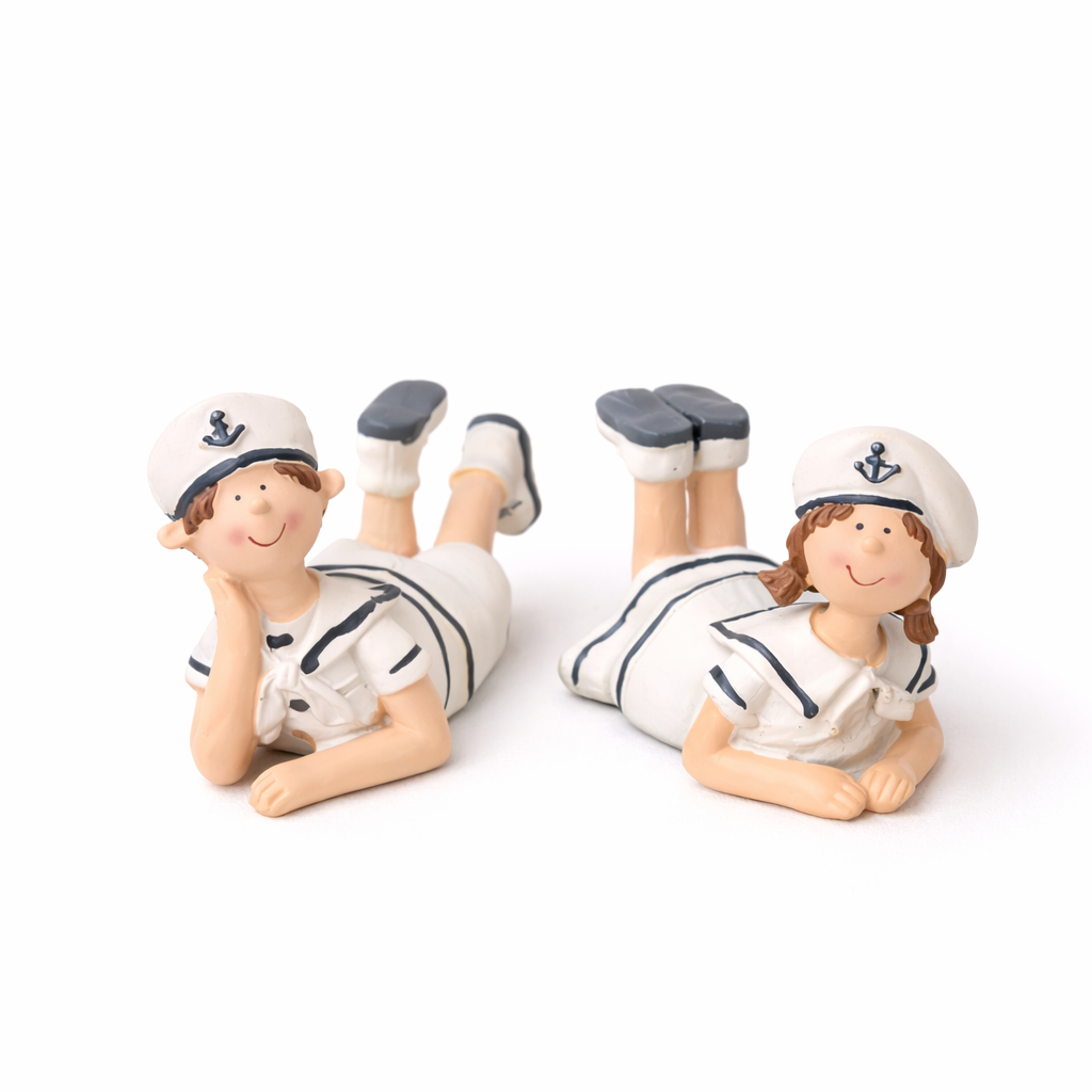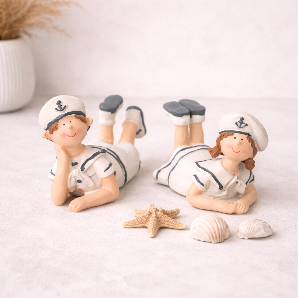 أضف لمسة مرحة ومبهجة إلى منزلك مع طقم مجسمات أطفال بحّارة، وهو طقم أنيق يضم مجسمين لطفلين مبتسمين بملابس بحّارة كلاسيكية مع قبعات بطابع بحري مميز.