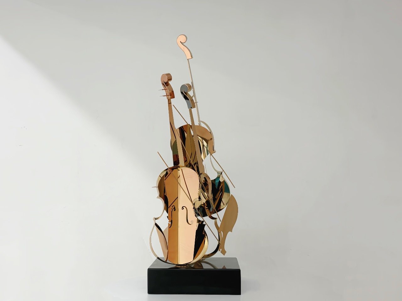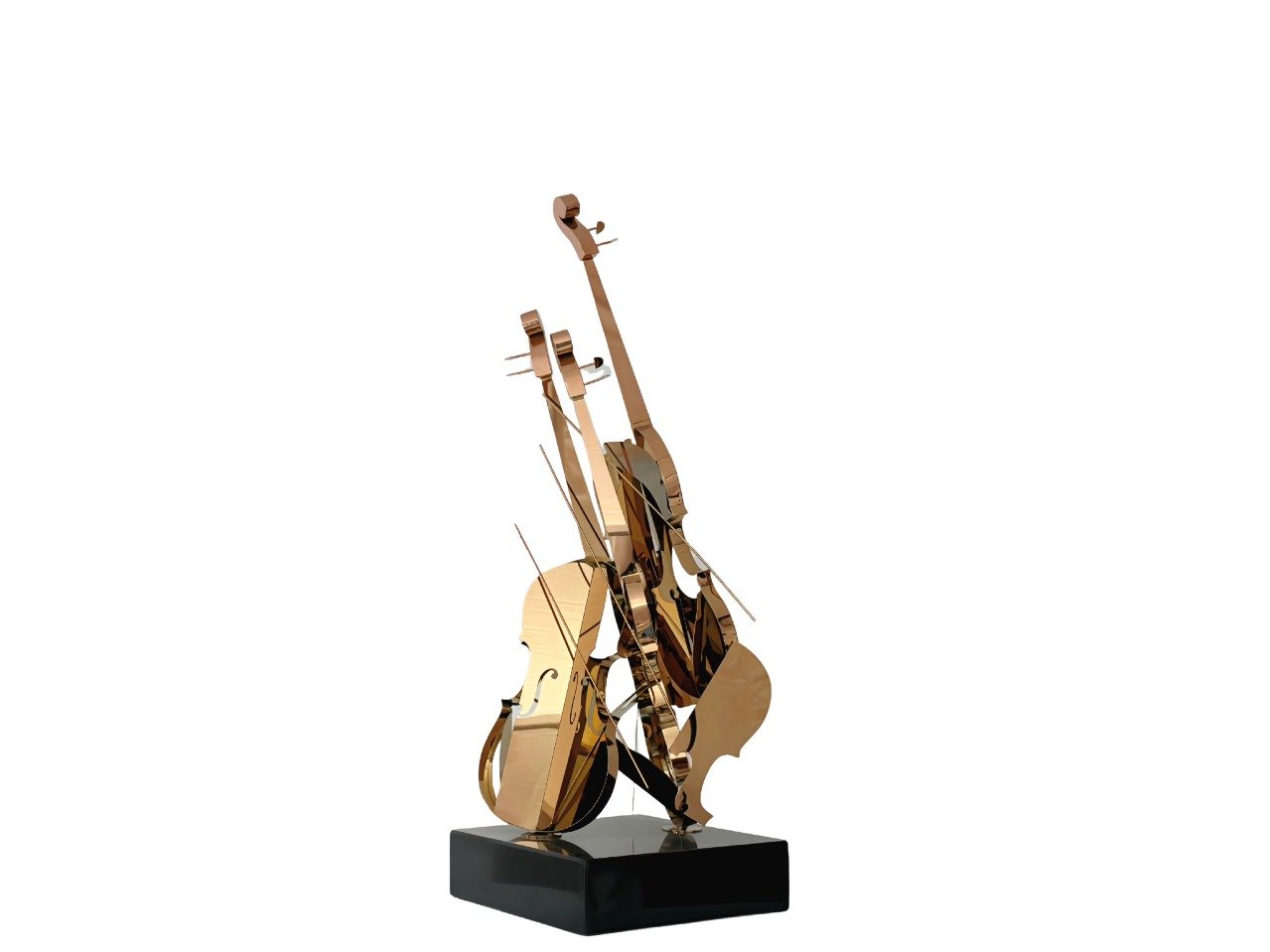 قطعة فنية استثنائية تجسد الفخامة بروح موسيقية. تمثال ديكوري مصنوع من ستانلس ستيل ذهبي بتصميم آلات كمان وتشيللو متداخلة، مثبت على قاعدة رخام أسود فاخر تمنحه ثباتًا وأناقة إضافية. مثالي ليكون عنصرًا محوريًا في غرف المعيشة، المكاتب أو القاعات الفاخرة، ويعبر عن الذوق الرفيع لمحبي الفن والديكور المستورد عالي الجودة.