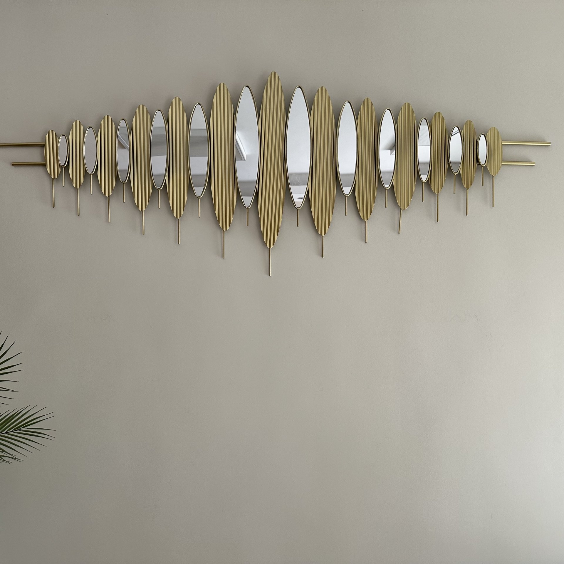 امنح حوائطك لمسة فنية معاصرة مع قطعة الديكور المعدنية الأفقية هذه. تصميمها التجريدي الفريد يجمع بين الخطوط والأشكال باللونين الذهبي والفضي اللامع لخلق نقطة بؤرية أنيقة. مصنوعة من المعدن عالي الجودة، هذه القطعة مثالية لغرفة المعيشة أو المدخل أو فوق الأريكة لإضافة الرقي والتميز.