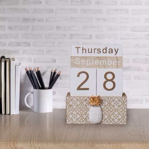 أضف لمسة من الأناقة والتميز إلى مساحتك مع هذا التقويم الخشبي اليدوي بتصميم عصري وزخارف شرقية أنيقة. يتميز بتفاصيل ناعمة وألوان هادئة، مع لمسة فاخرة على شكل أناناس ذهبي في المنتصف، مما يجعله قطعة ديكور رائعة بجانب كونه تقويم عملي قابل للتحديث اليومي. مصنوع من خشب متين بجودة عالية، ويتيح لك تغيير الأيام، الشهور، والتواريخ بسهولة. لا حاجة للبطاريات أو التقنيات — فقط تصميم ثابت يرافقك طوال العام.