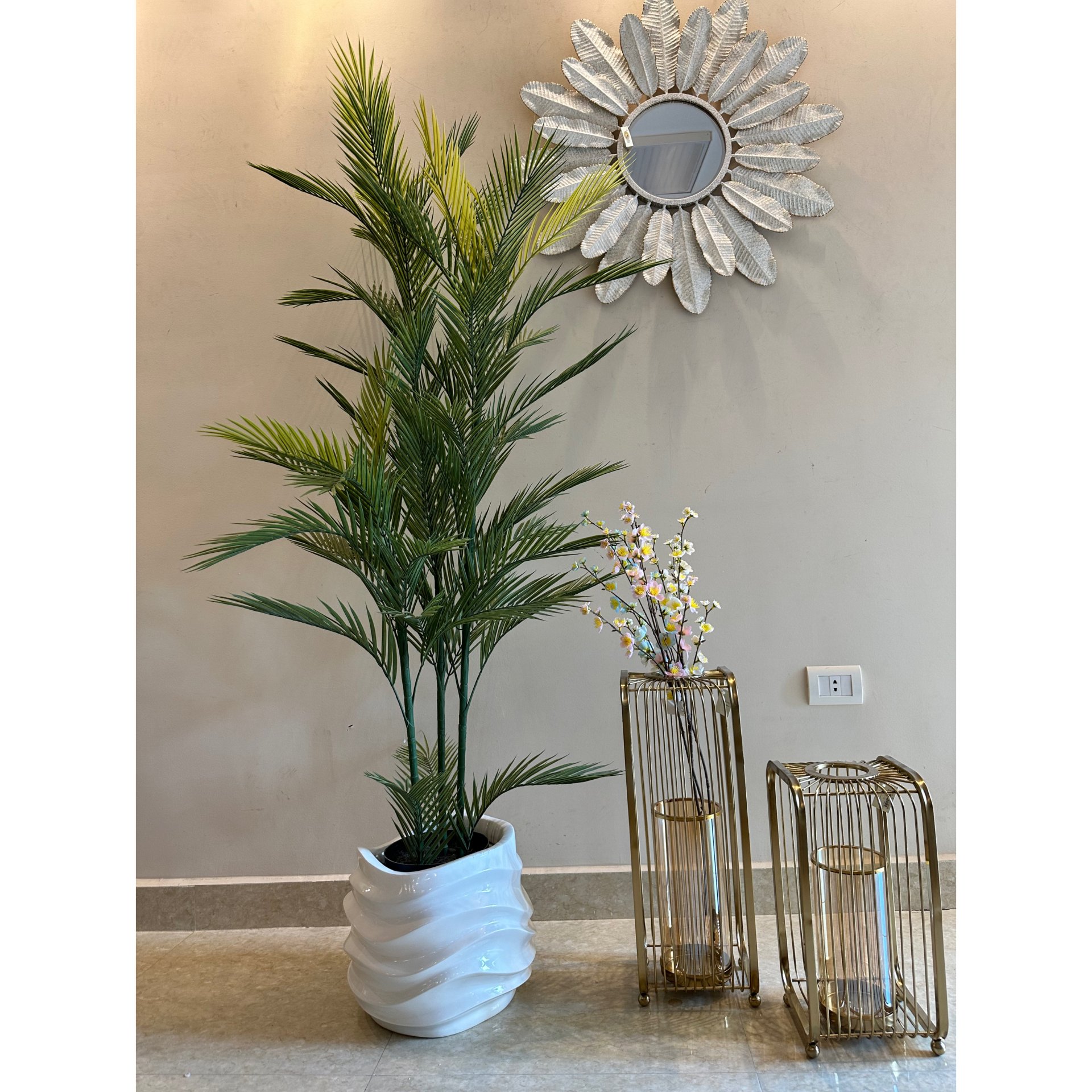 A lifelike artificial palm tree brings a natural touch, planted in a high-quality white fiberglass pot with a sleek spiral design that adds a refined modern edge.