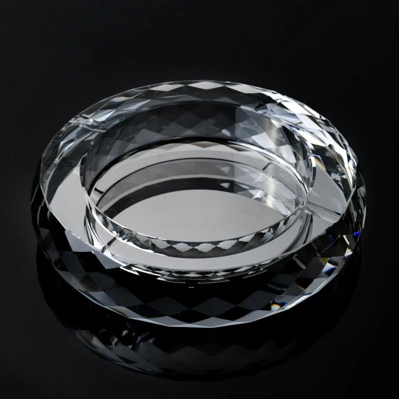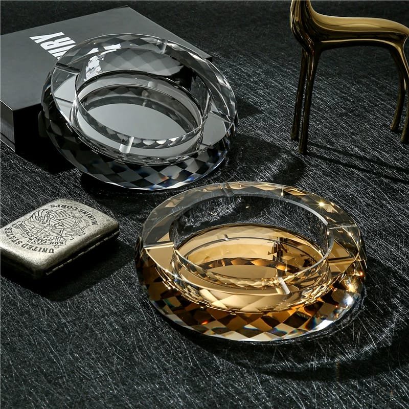 A luxurious round crystal ashtray designed with exquisite craftsmanship to reflect light in dazzling patterns. Available in gold and clear finishes, and offered in 3 different sizes to suit various needs. A perfect blend of elegance and functionality, making it an ideal décor piece for homes, offices, or lounges.