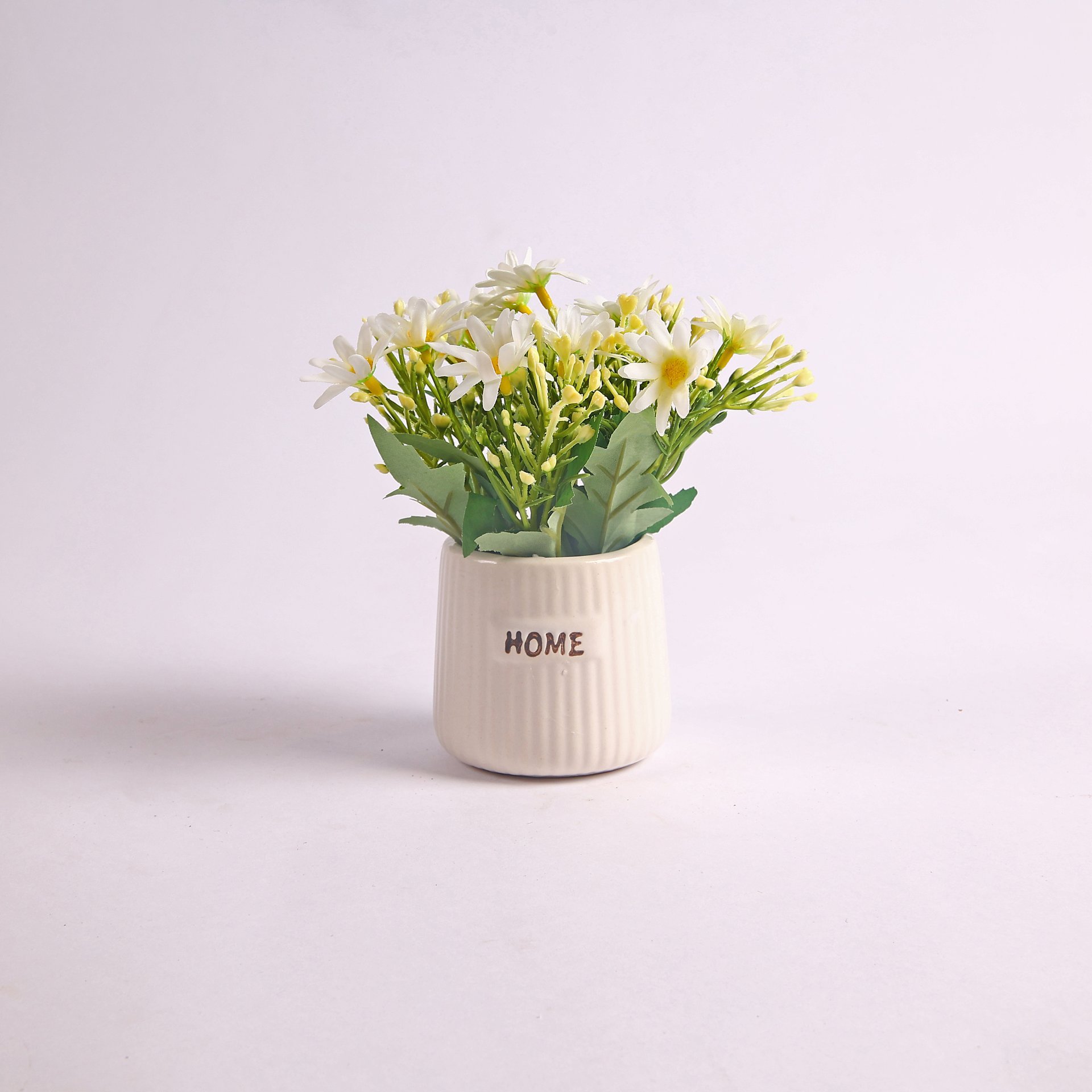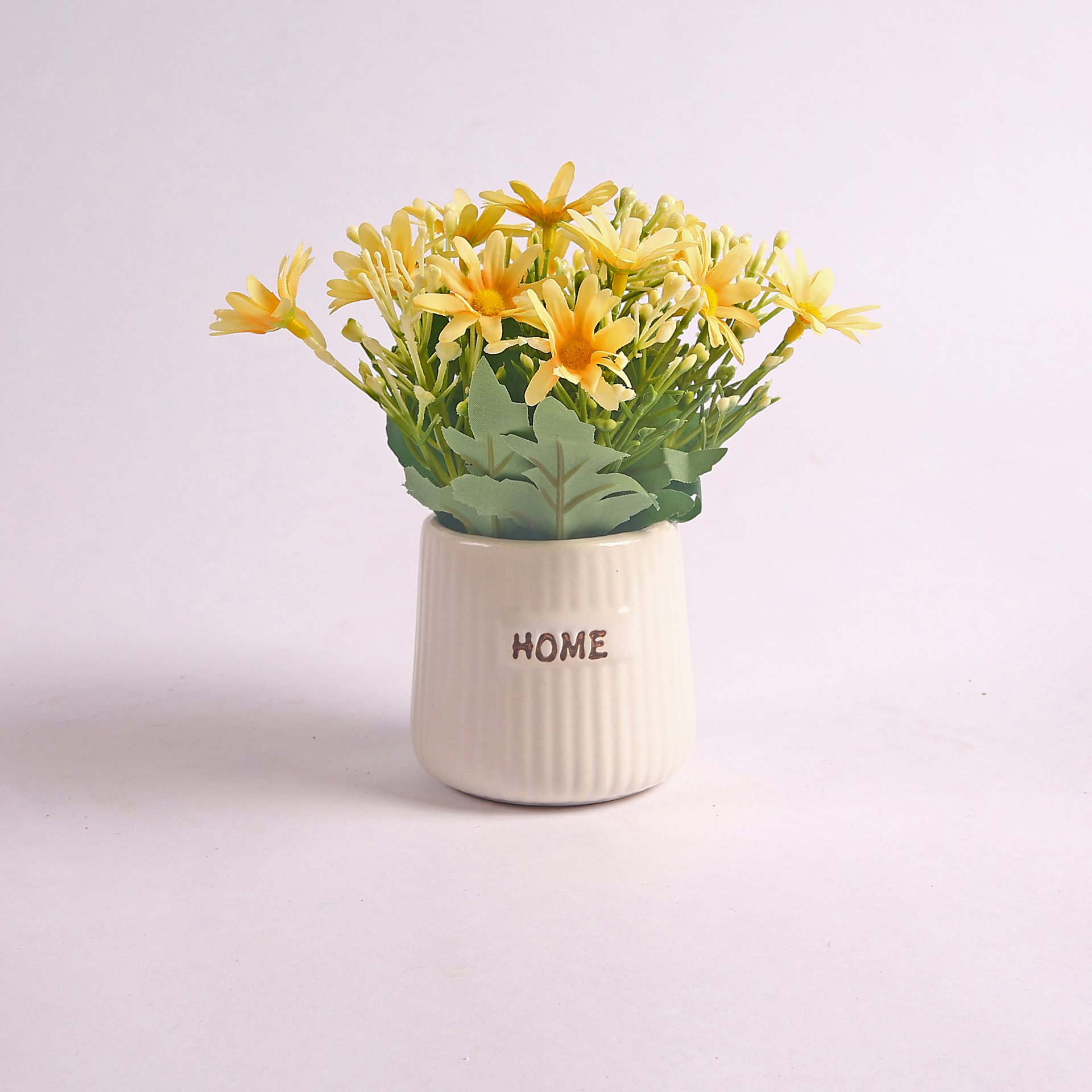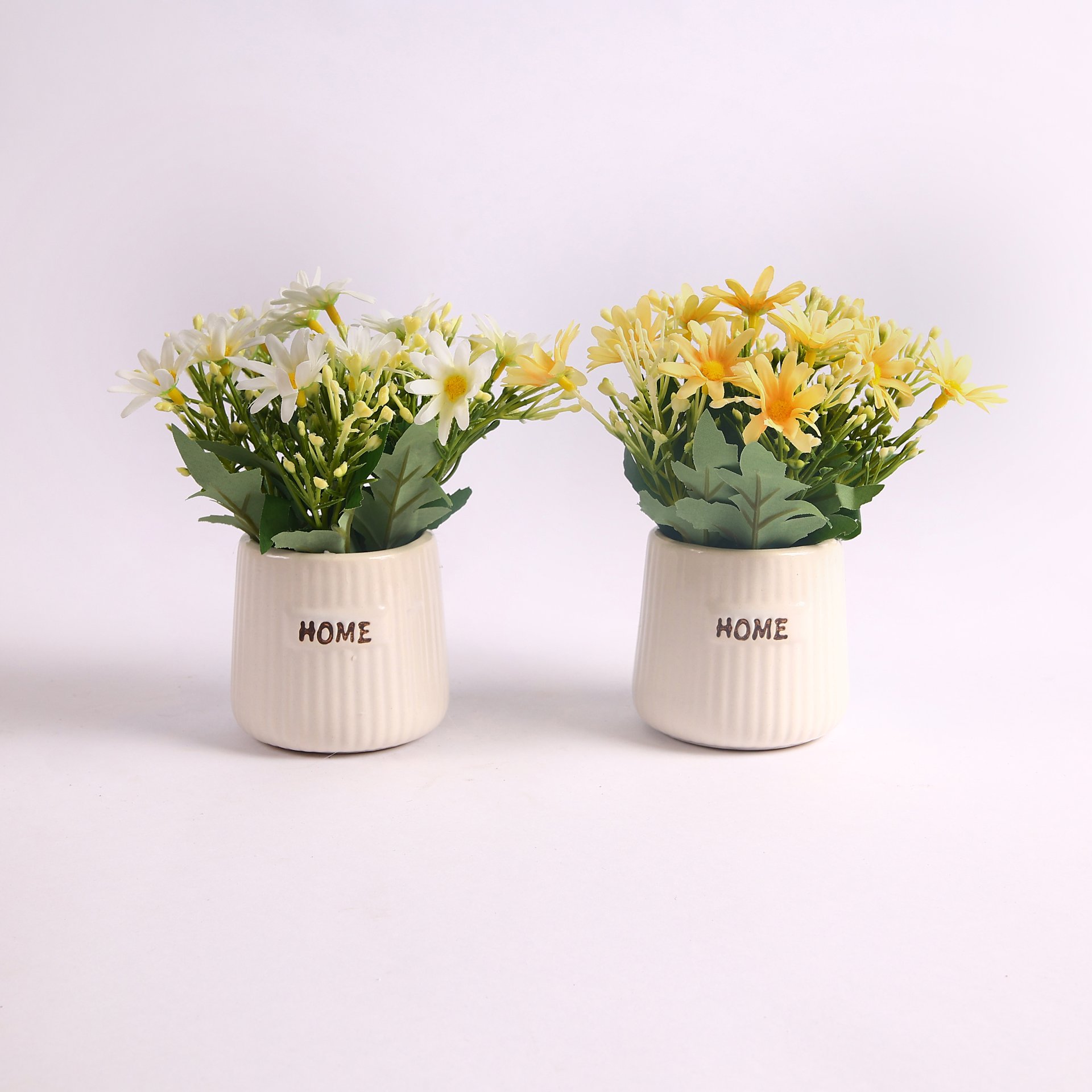 Enjoy the beauty of flowers without the need for care with this stunning set of artificial flowers! This collection features blooms in white and yellow, placed in elegant ceramic pots labeled "HOME," making them a perfect addition to the decor of any room. These flowers require no sunlight or water, making them an ideal choice for decorating tables, shelves, or even as a wonderful gift for friends and family. With these flowers, you can introduce a touch of nature into your home without any hassle!