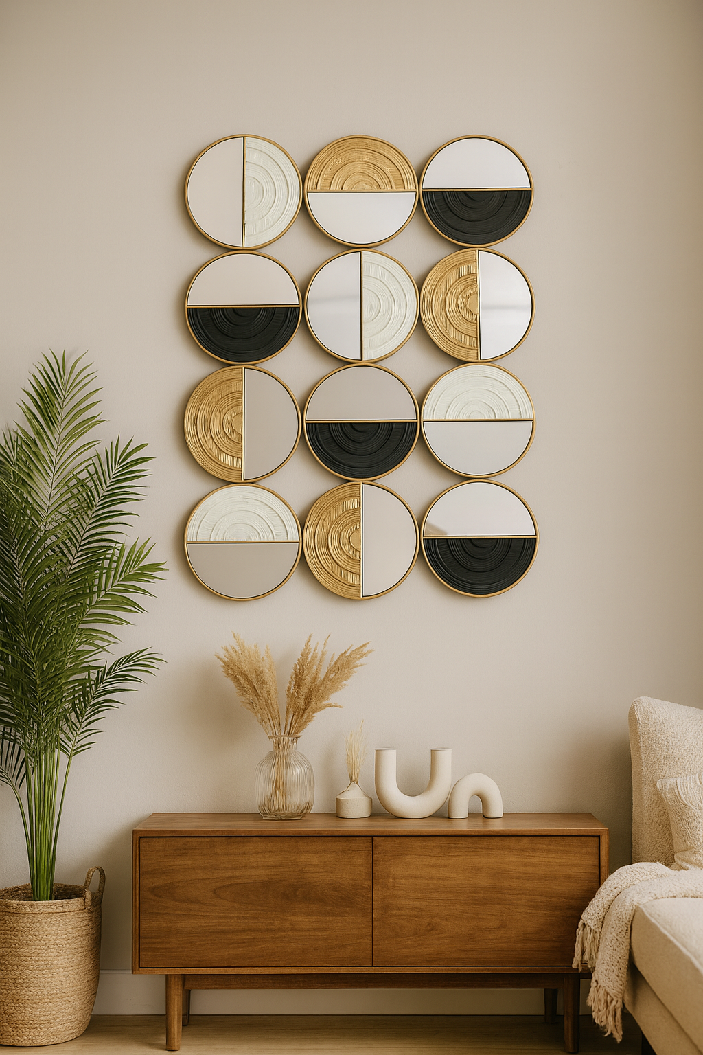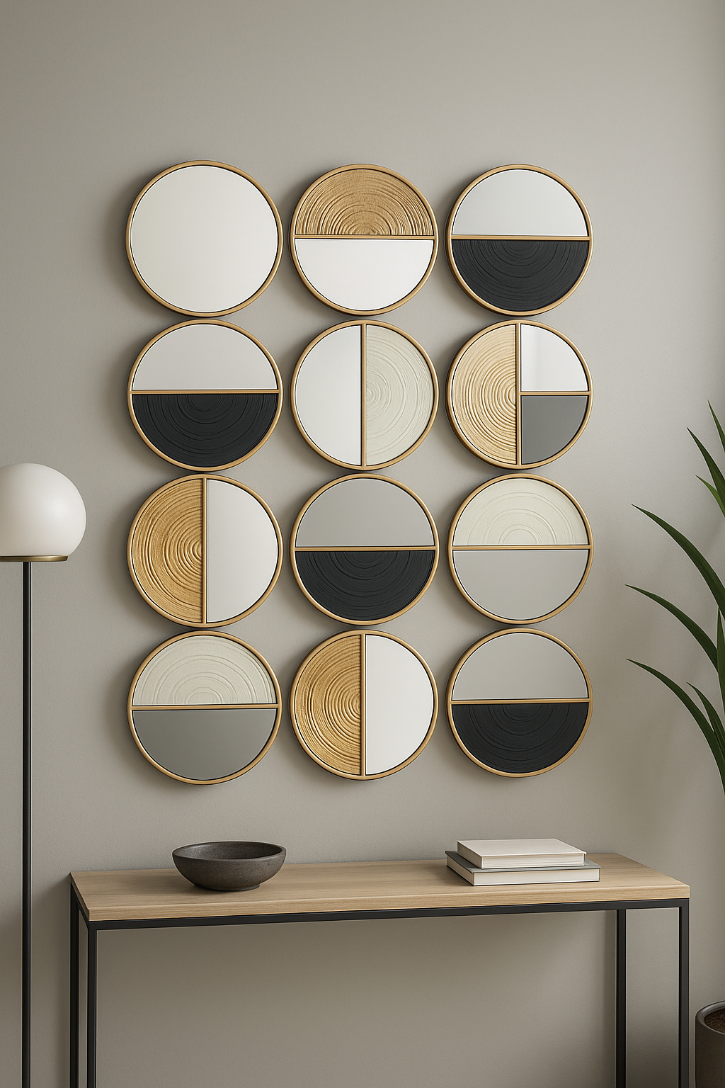 Turn your wall into a statement with this striking round mirror wall decor set. Featuring 12 metallic-accented circular pieces, each divided into halves that blend sleek mirrors with modern metal textures and elegant tones. A perfect fit for living rooms, hallways, or bedrooms. Made with premium metallic finishes, this artistic design adds contemporary flair and sophistication to any interior.