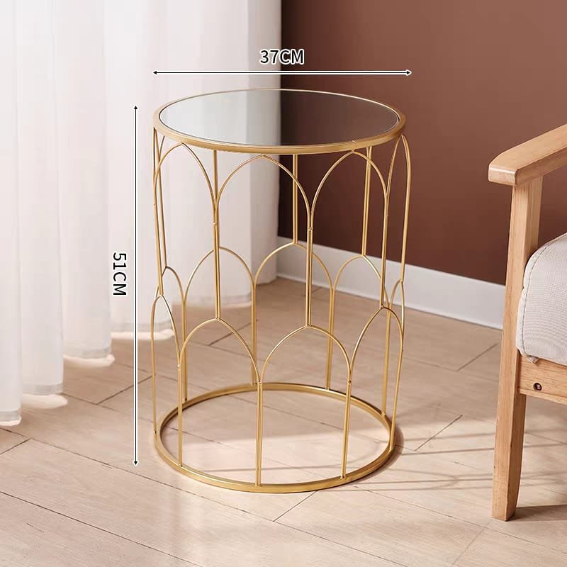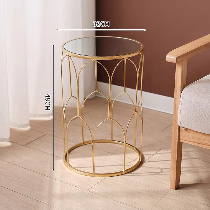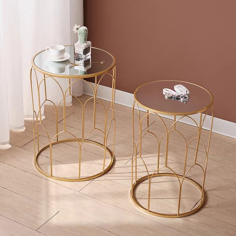 A luxurious set of two side tables featuring reflective glass tops and elegant gold metal frames with a geometric pattern. Perfect for living rooms or guest areas to add a touch of sophistication and modern charm.