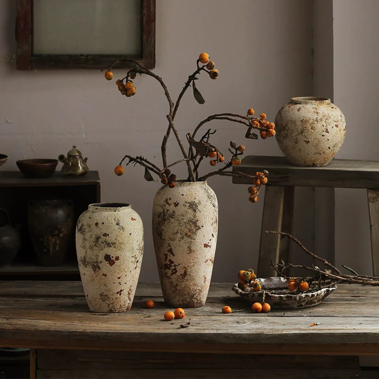 A set of antique clay vases with a natural design and authentic rustic charm, featuring a weathered texture and earthy tones that embody the beauty of time and simplicity. Perfect for decorating interiors and adding a warm, elegant ambianc