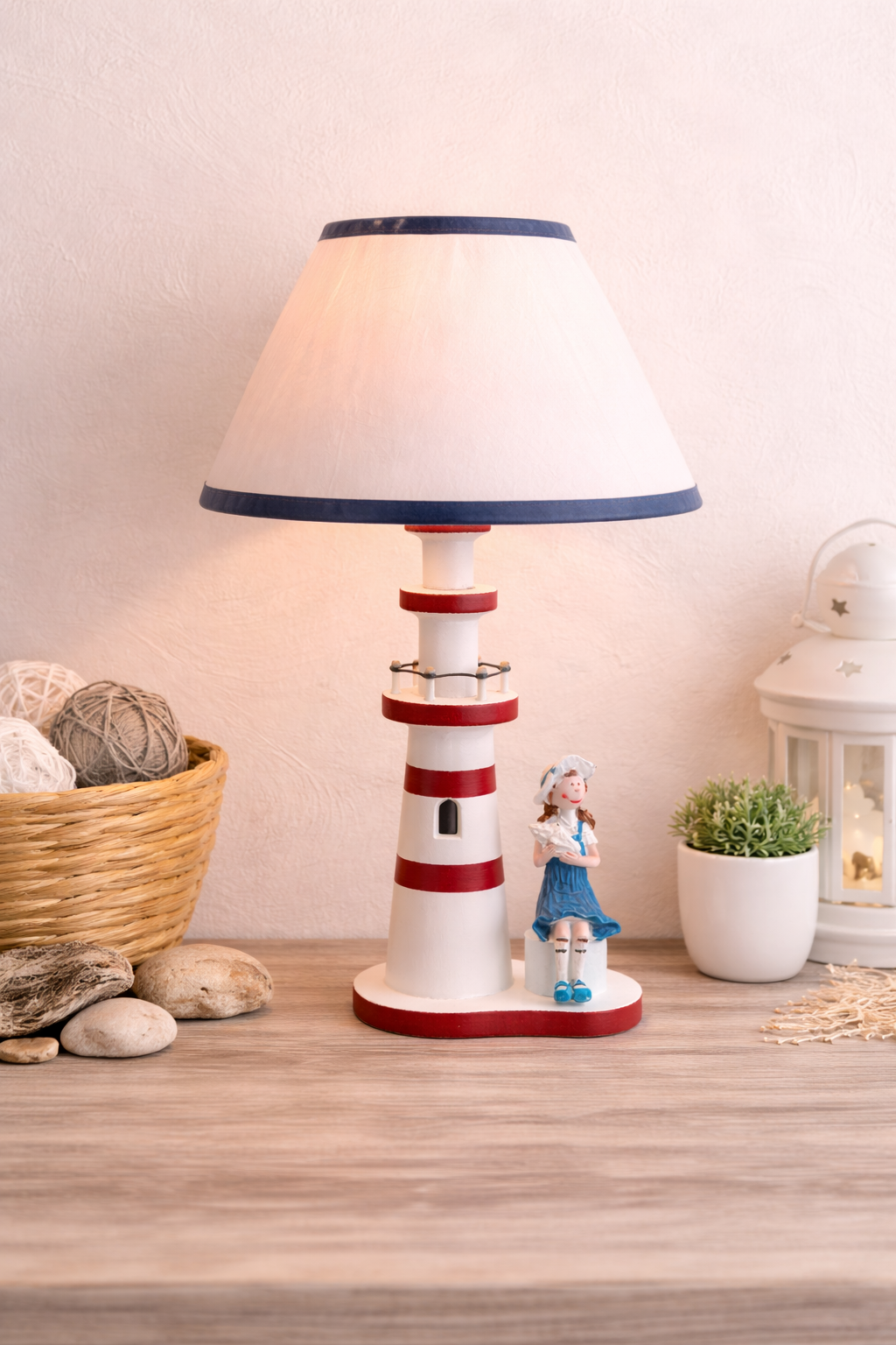 Finished with a clean white lampshade trimmed in navy blue, plus a cute seaside figurine detail at the base, this lamp creates a cozy atmosphere while serving as a stylish statement piece.