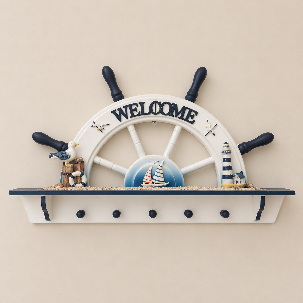 Upgrade your wall décor with this beautifully crafted nautical welcome shelf, inspired by classic ship steering wheels and seaside landscapes. Designed with decorative lighthouse, sailboats, seagull accents, and a charming “WELCOME” sign, this multifunctional piece combines style with practicality. The upper shelf is perfect for displaying small décor items, while the lower hooks are ideal for keys, bags, towels, or accessories. Finished in timeless navy blue and white tones, it suits beach houses, chalets, entryways, bathrooms, kitchens, or coastal-themed interiors.