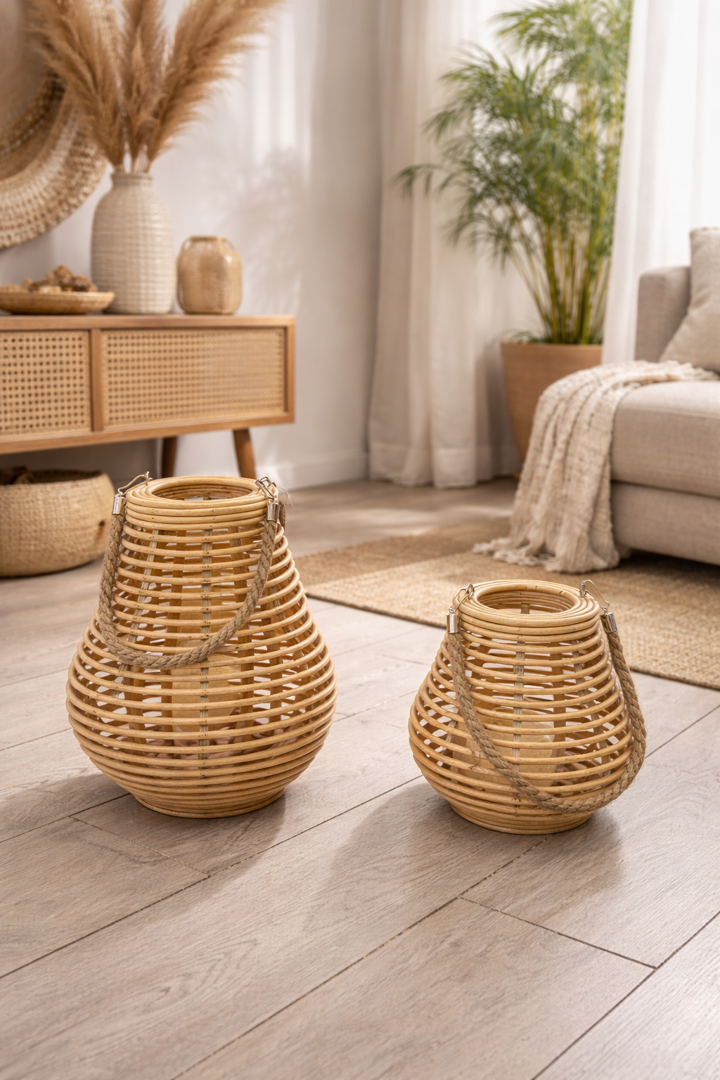 Bring warmth and natural charm into your home with the Boho Rattan Lantern Set. This beautiful set includes two handcrafted lanterns made from woven natural rattan with sturdy rope handles, combining rustic elegance with modern bohemian style.