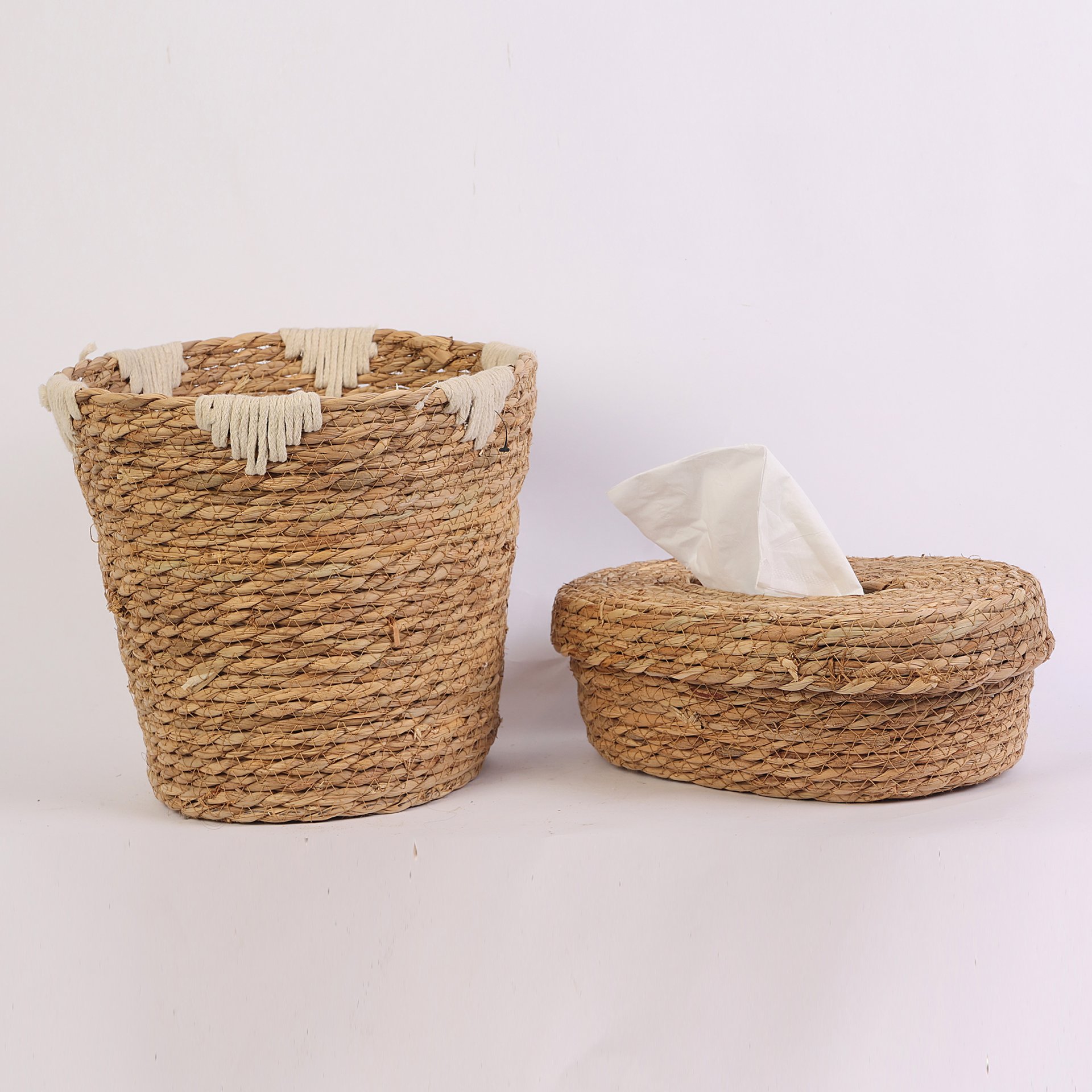 Handcrafted tissue box and basket made from wicker and natural fibers, featuring a stylish design that blends natural beauty with practical functionality. These eco-friendly pieces add a touch of warmth and rustic elegance to any decor. The tissue box is perfect for placing on tables or shelves, while the basket can be used for storing small items or as a standalone decorative piece. The natural design and durability make them an ideal addition to any home looking for a touch of nature.