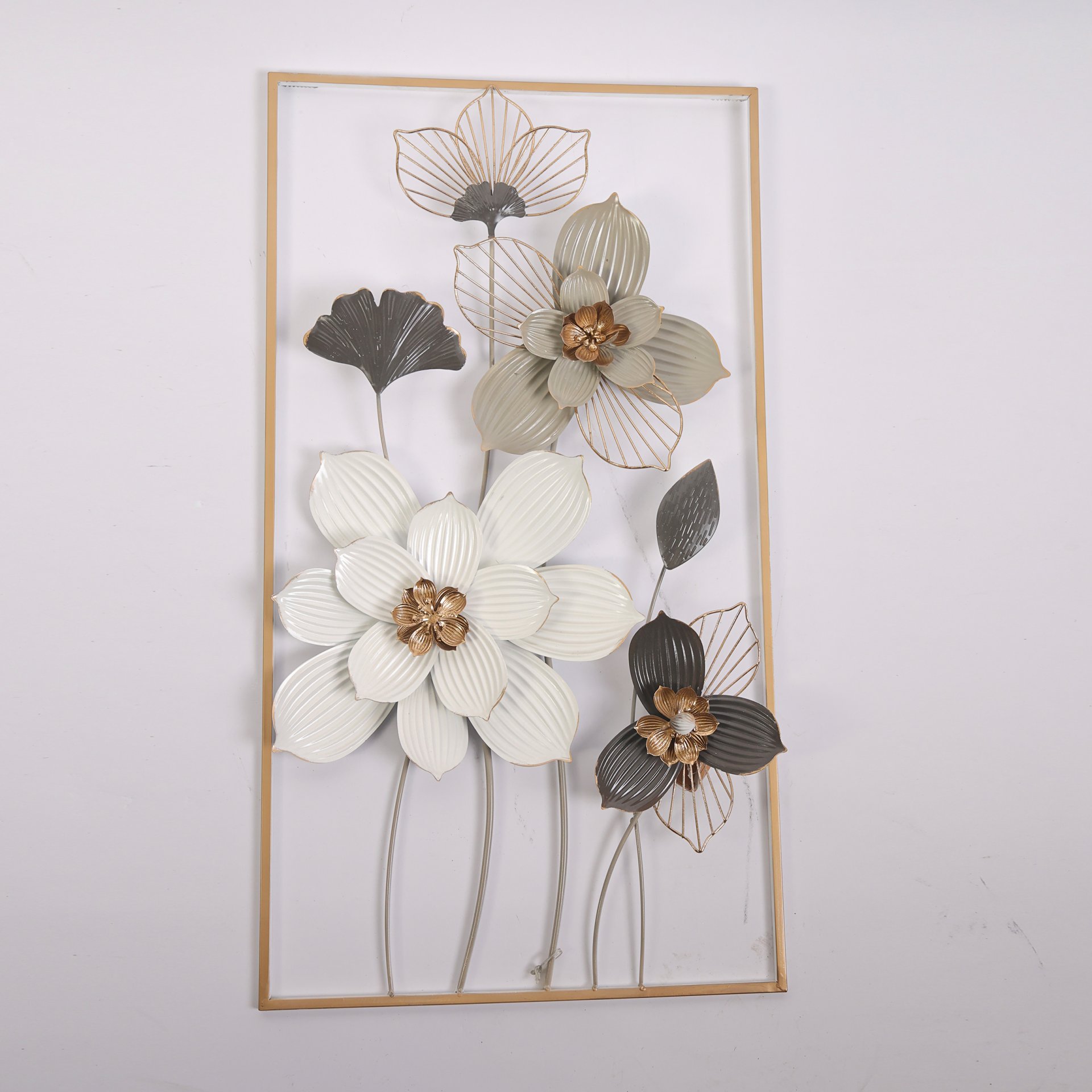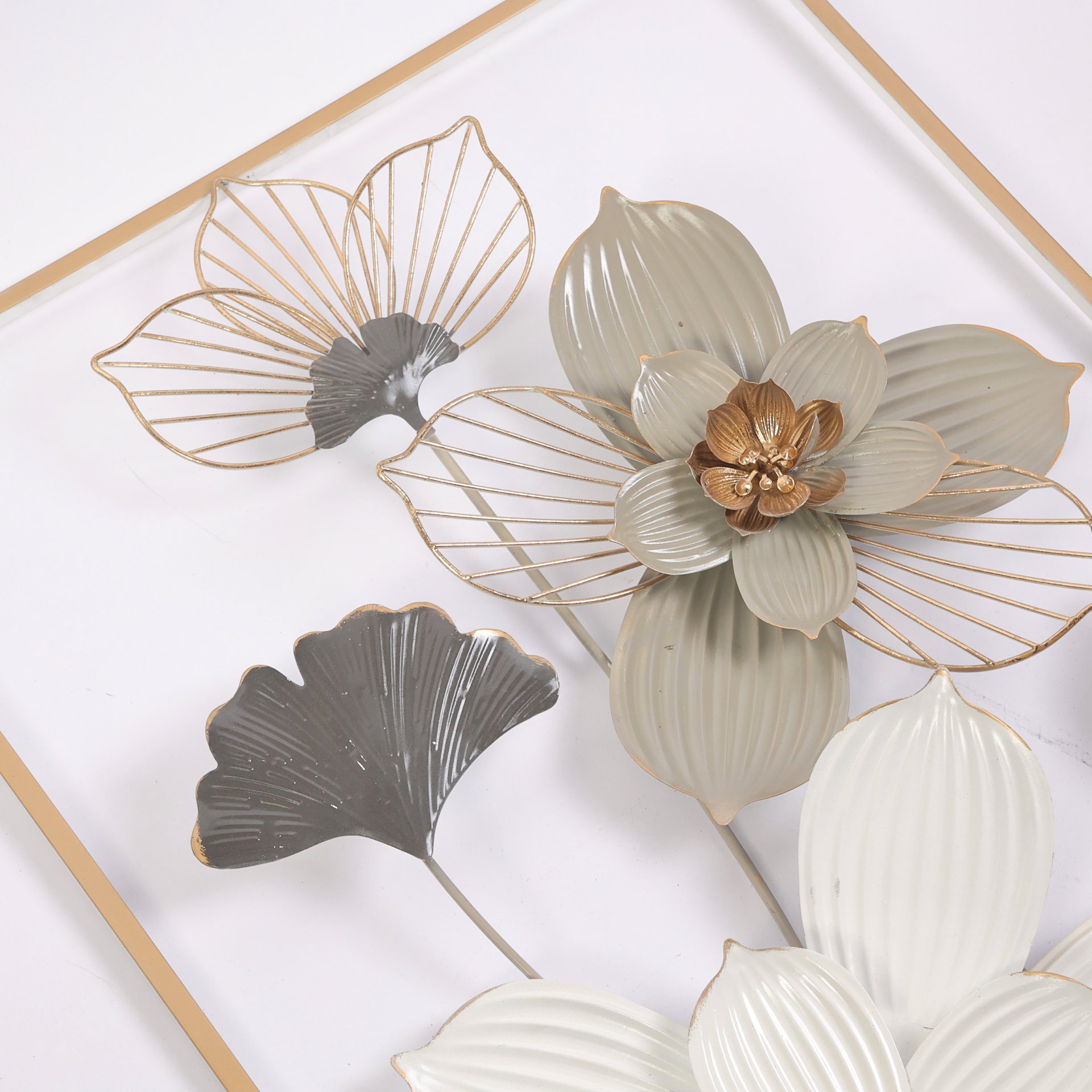 Adorn your walls with captivating beauty with this framed metal decor piece, featuring a design of flowers and leaves in harmonious colors like gold, white, and grey. Made from high-quality metal within a stylish frame, this art piece is perfect for bringing sophistication and vibrancy to any room with a modern style.