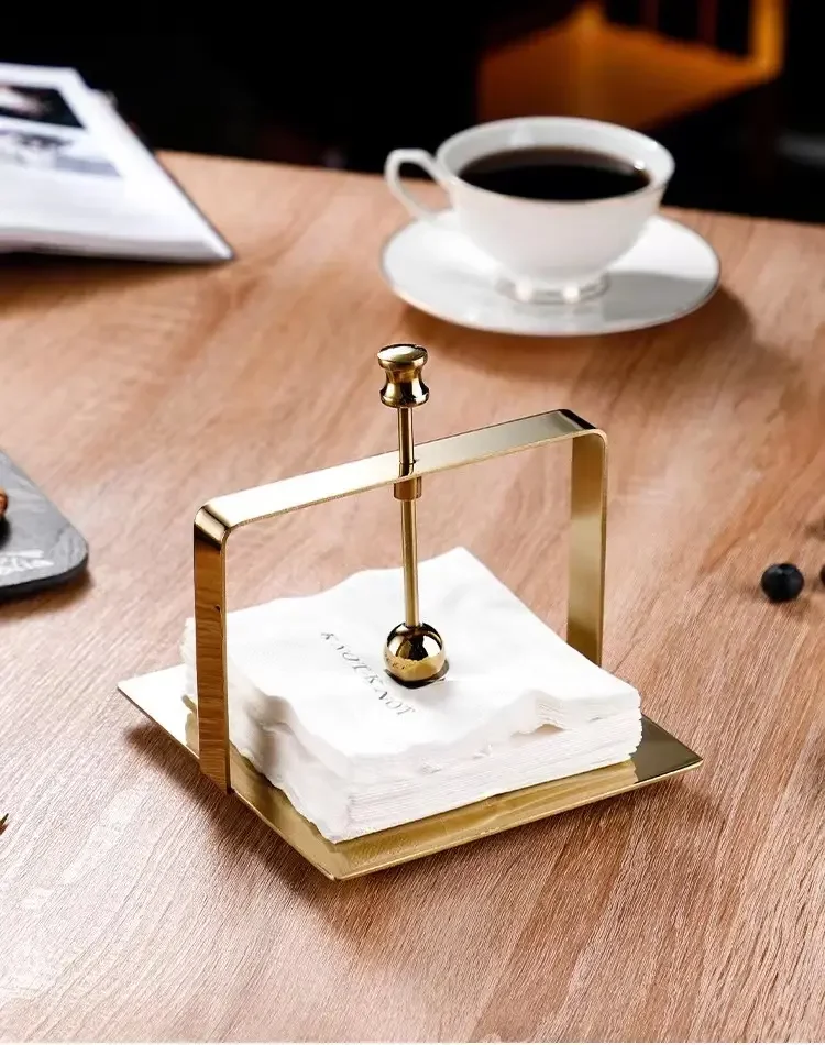 Elevate your table setting with this luxurious golden napkin holder. This modern design features a shiny gold finish that adds beauty to any occasion. Beyond its stylish appearance, the holder ensures napkins stay neat and easy to grab, making it a practical and elegant addition to your home or restaurant. Made from high-quality materials to guarantee durability and long-lasting use.