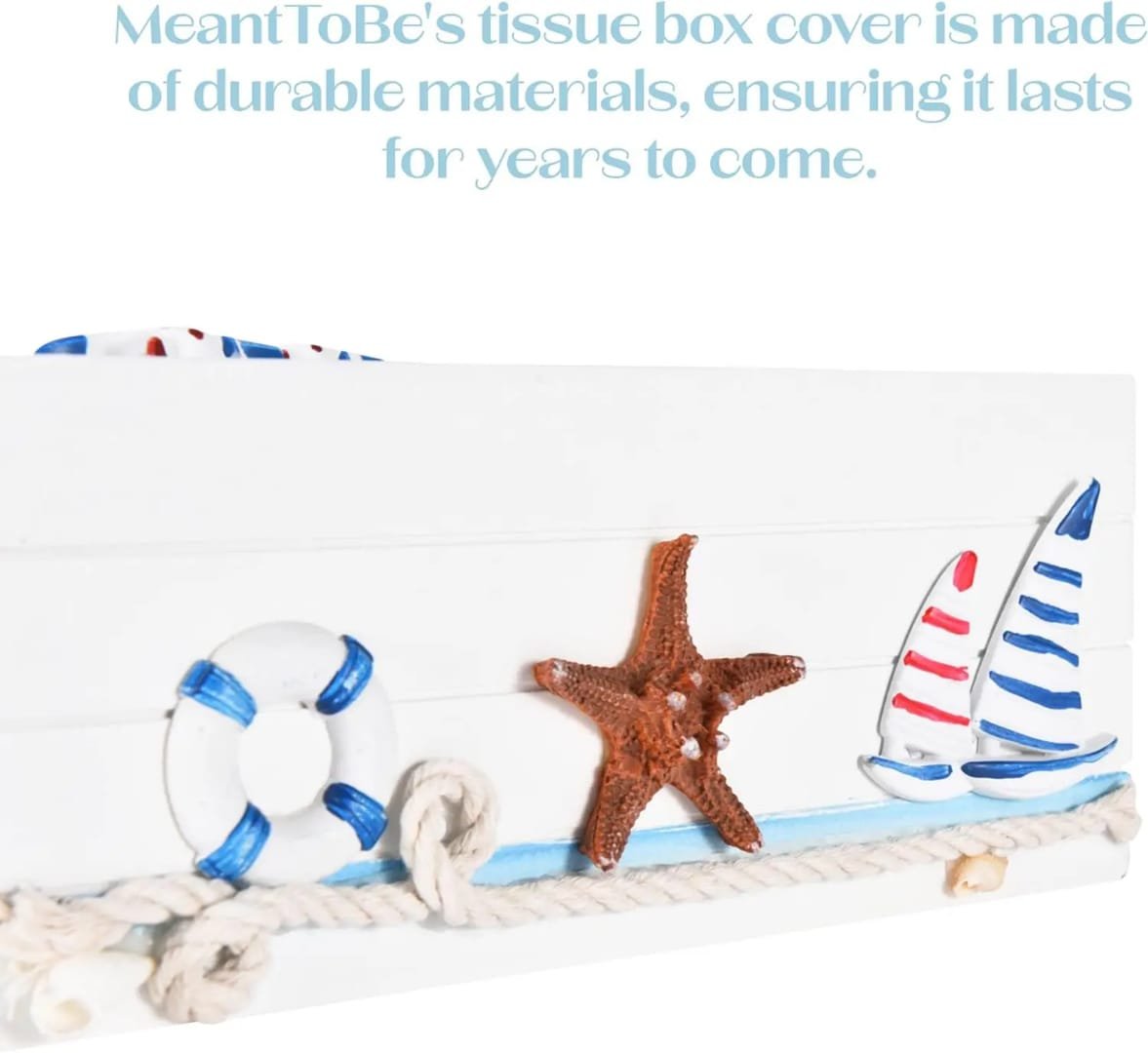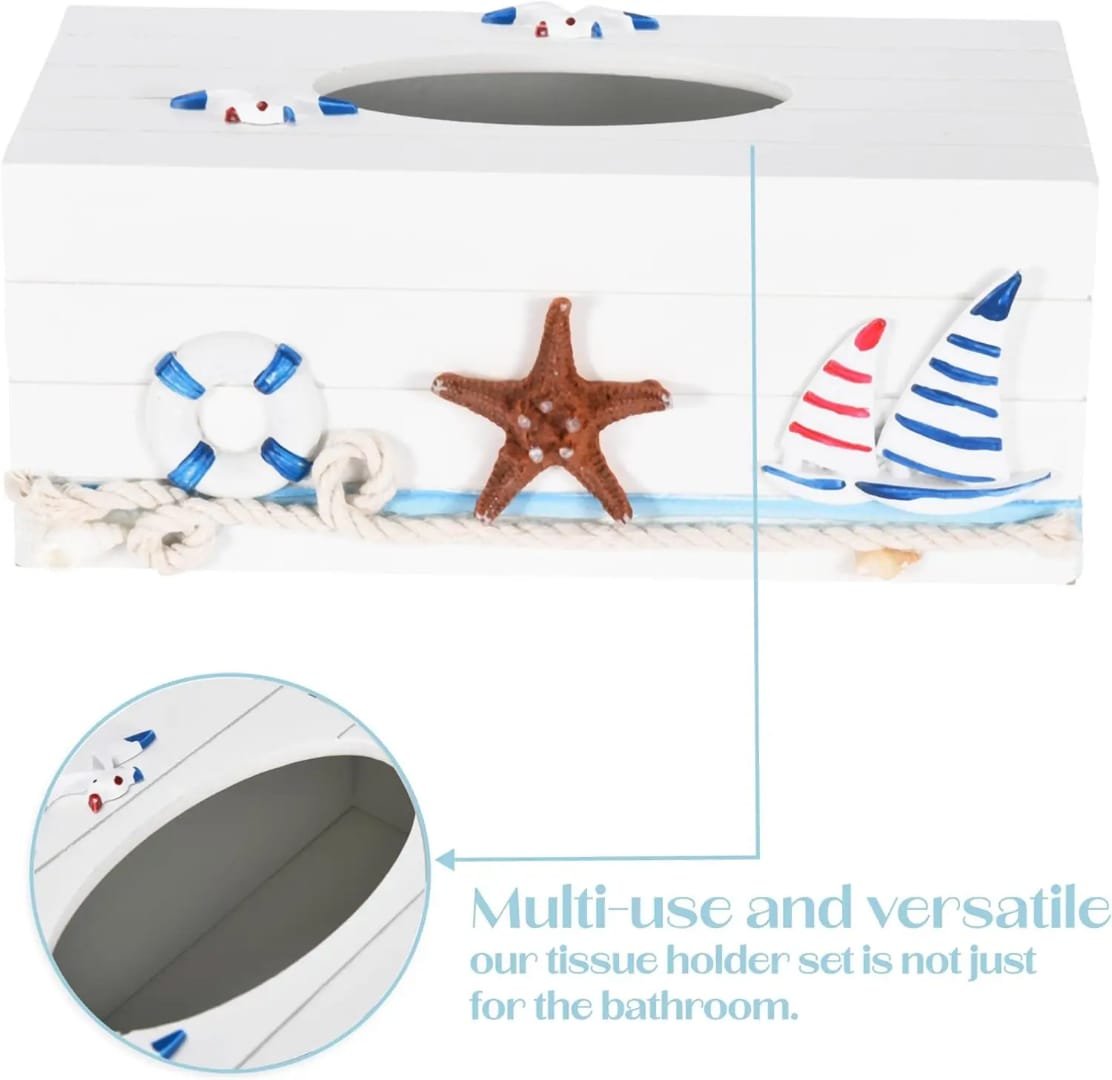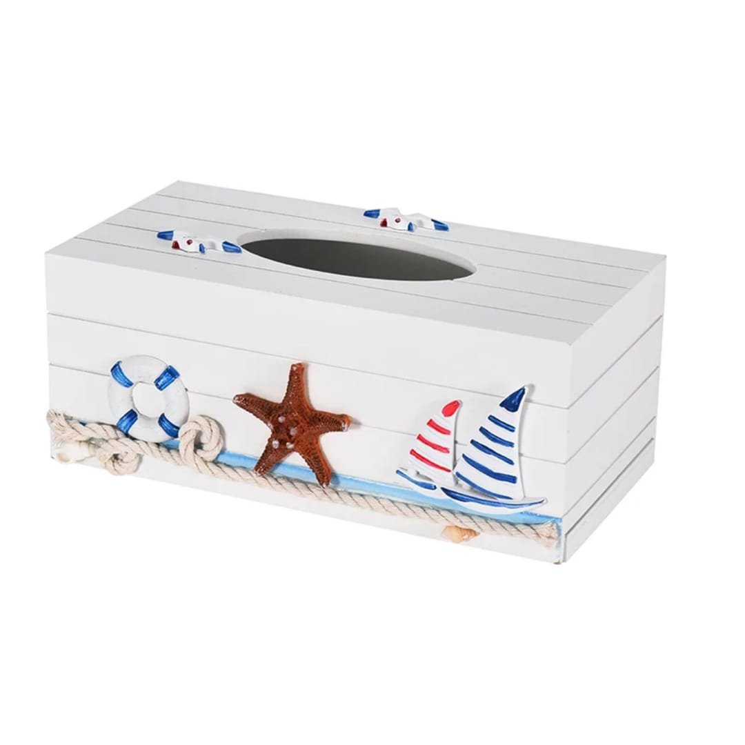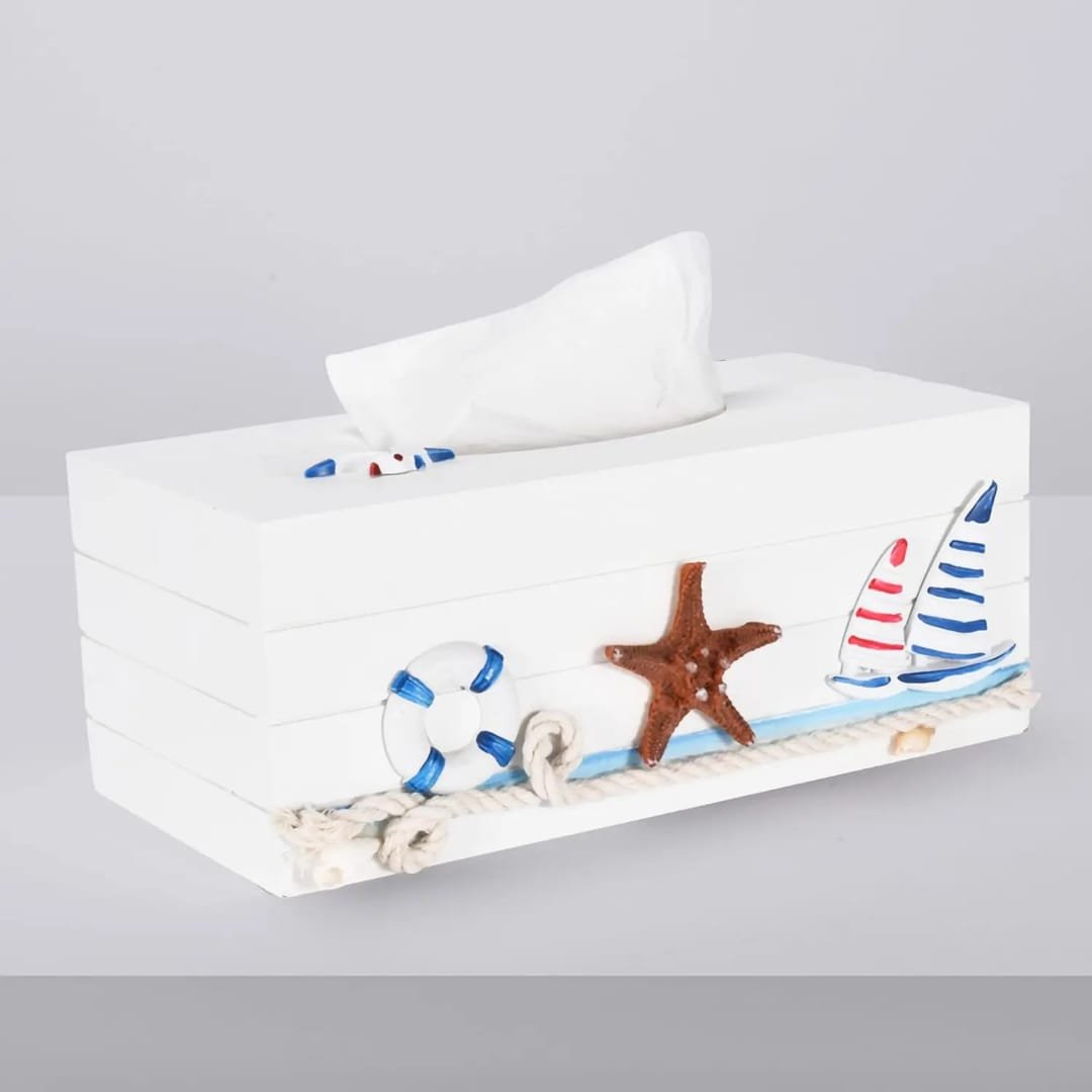 This tissue box is elegantly and uniquely designed, showcasing beautiful nautical details. It features a starfish, lifebuoy, and colorful boats, adding a creative touch. This piece can be a perfect addition to any room in the house, whether in the living room or office, as it combines functionality with beauty. Its pure white design allows it to blend seamlessly with various colors and decor, creating a comfortable and cheerful atmosphere.