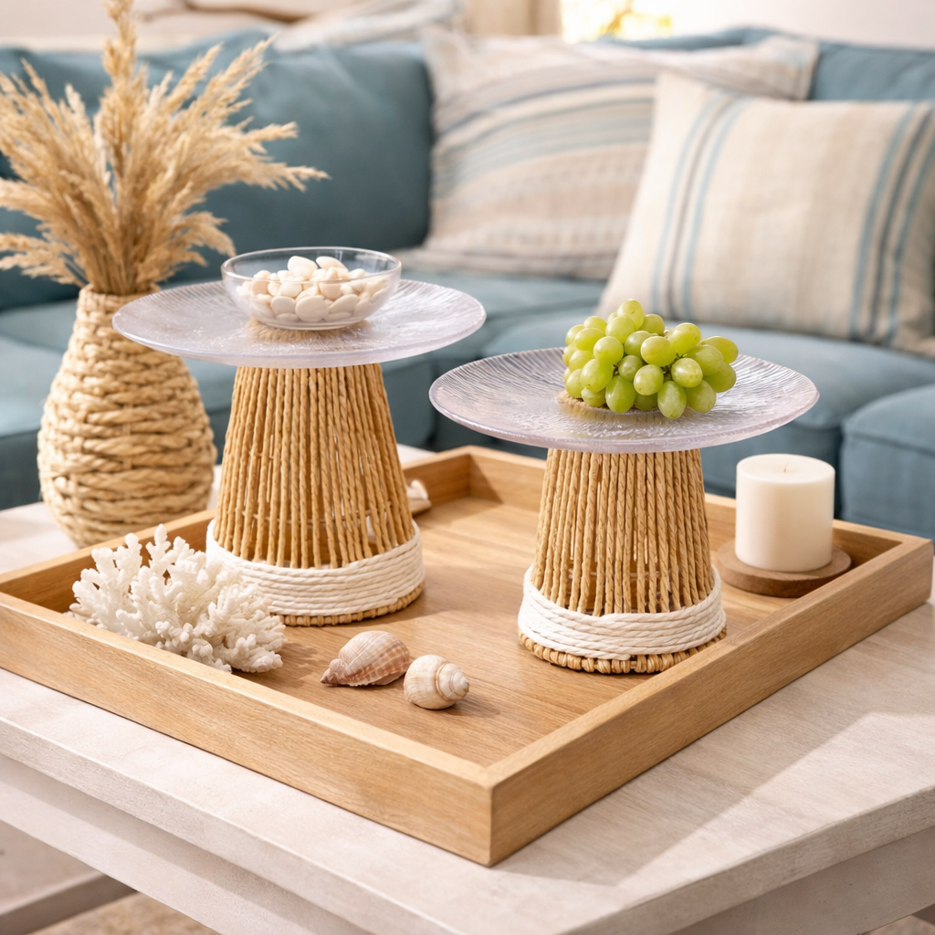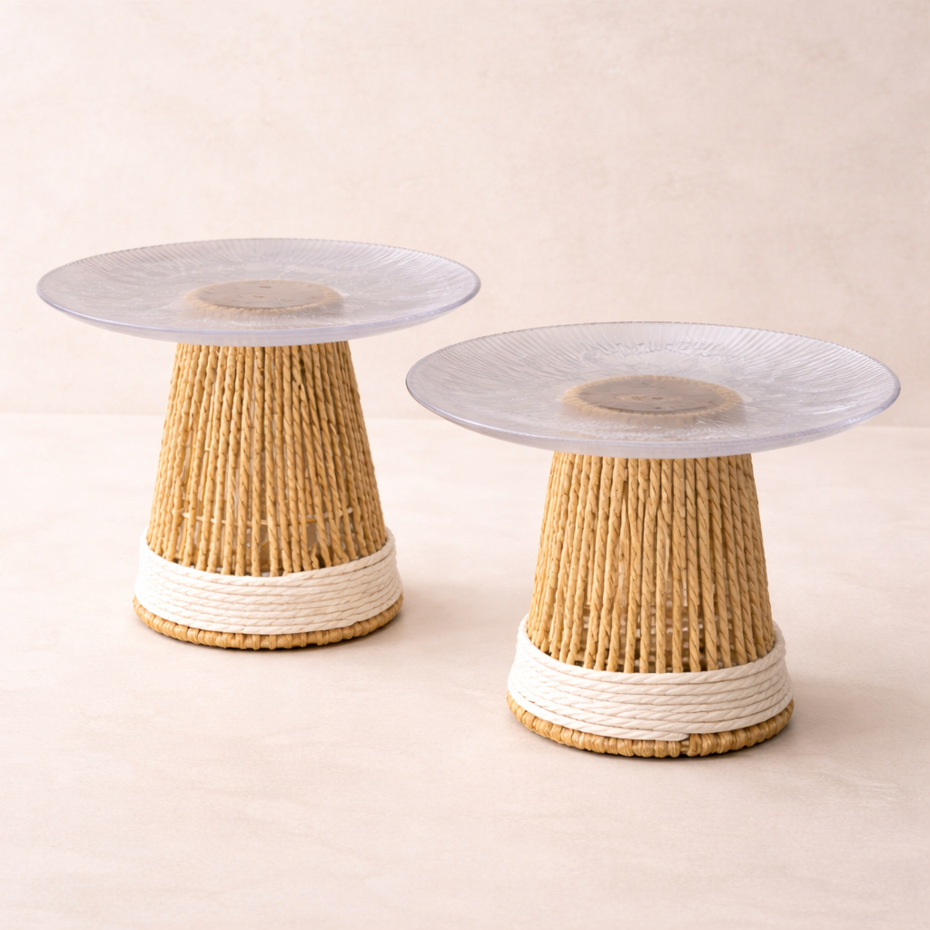 Bring natural elegance to your table with the Glass Cake Stand Set with Woven Base – Set of 2. Designed with clear textured glass tops and beautiful woven handcrafted bases, this set adds warmth and sophistication to any dining or coffee table.